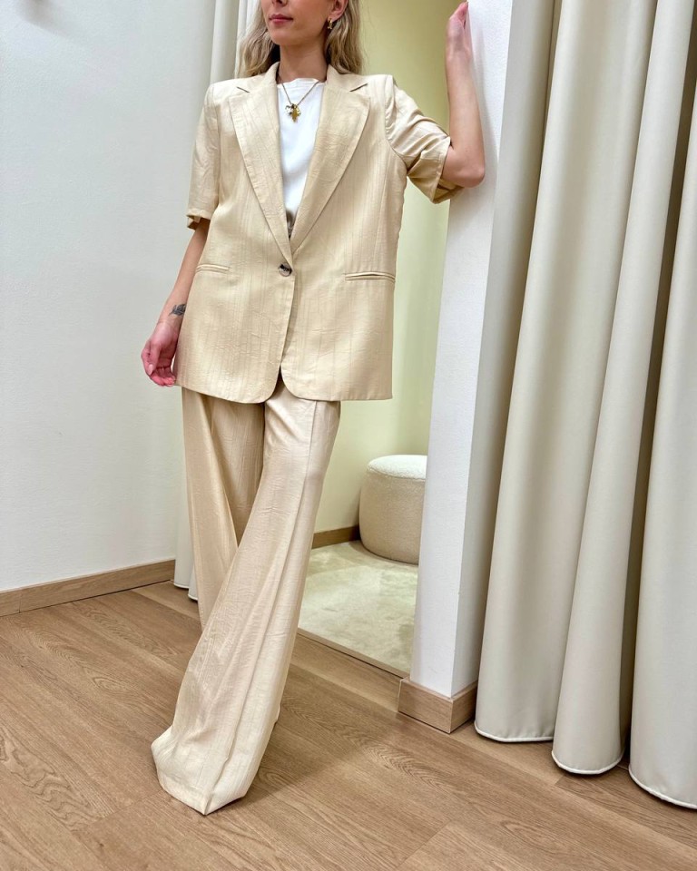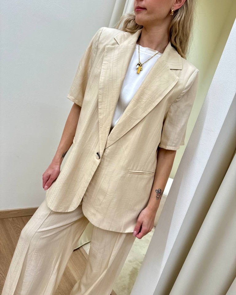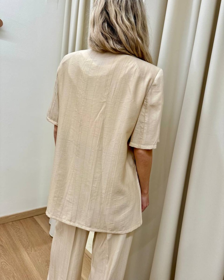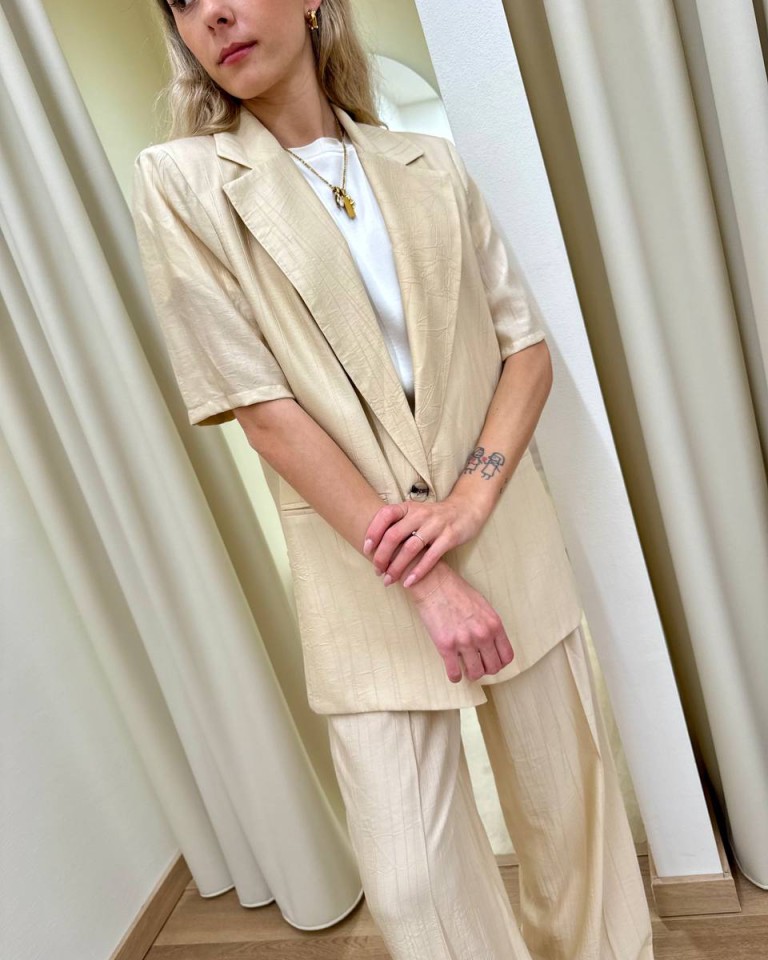 Giacca effetto stropicciato color burro, modello over con rever classico e chiusura con un bottone, maniche corte, tasche con patta, sfoderata. Vestibilità ampia.