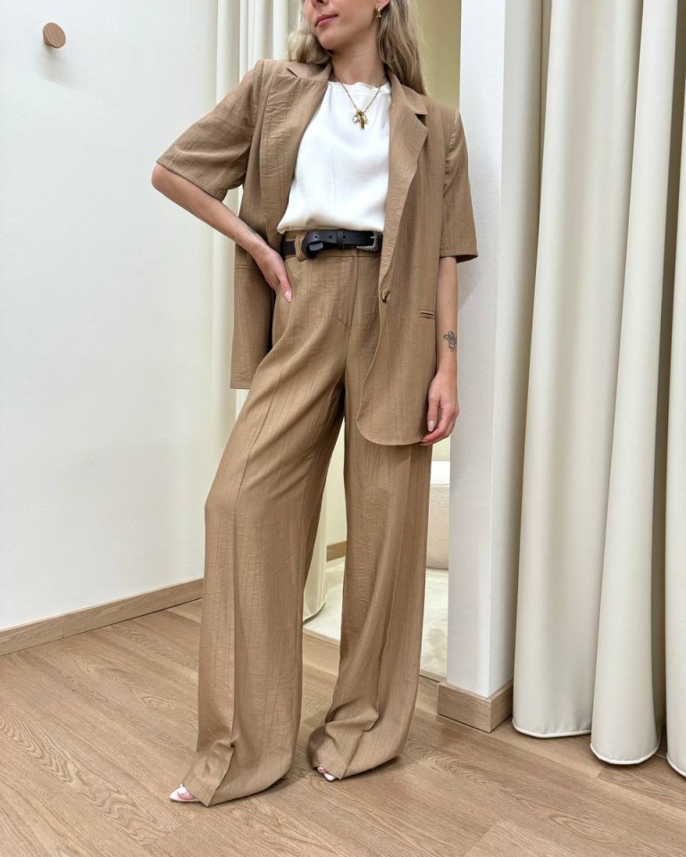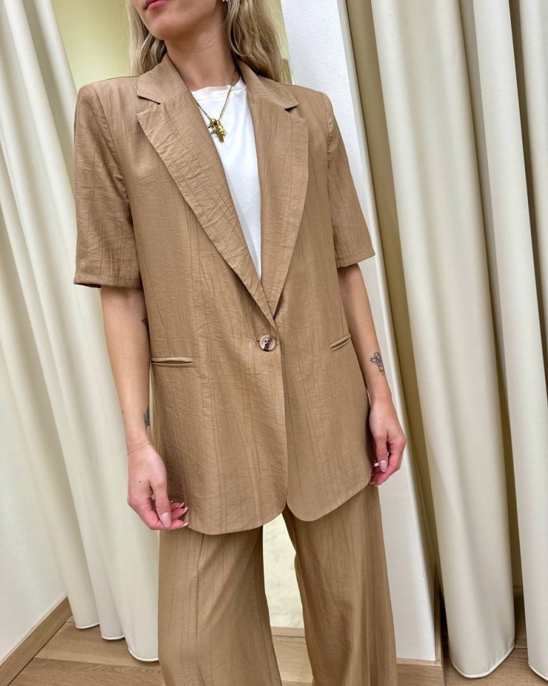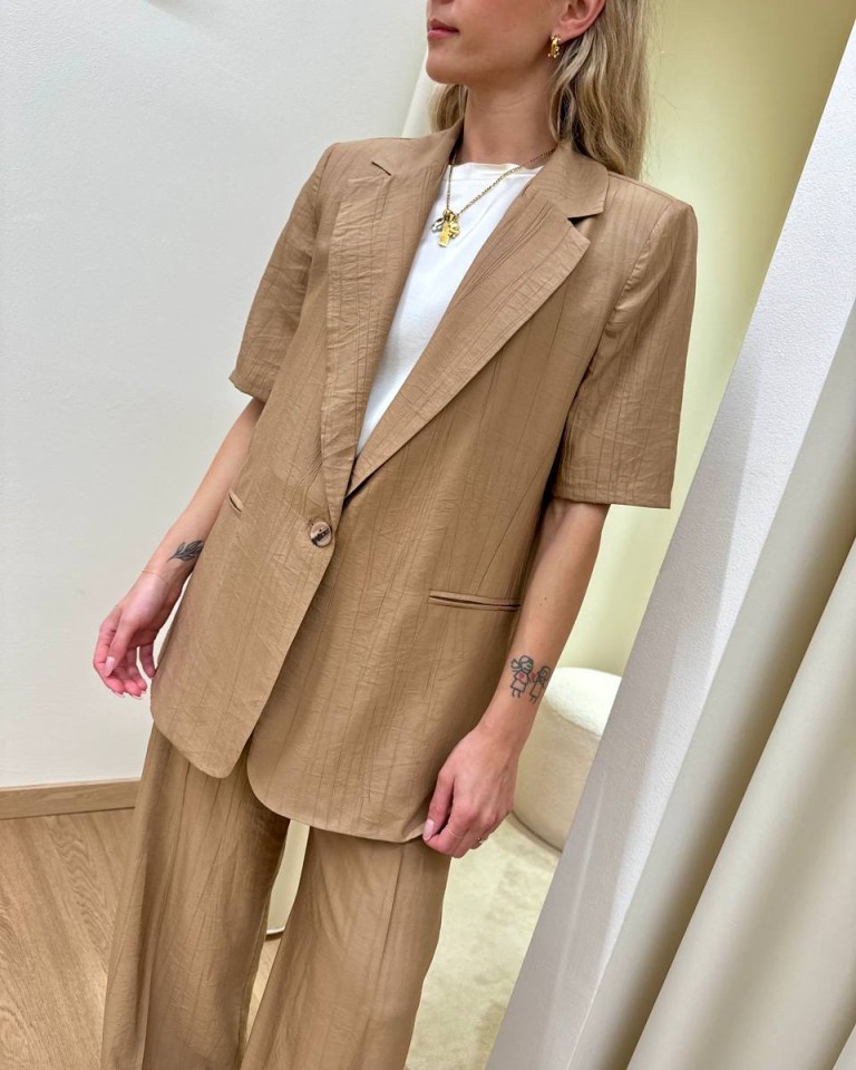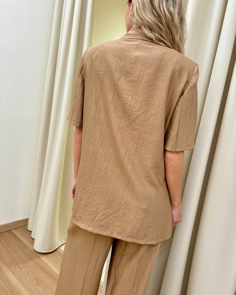 Giacca effetto stropicciato color cammello, modello over con rever classico e chiusura con un bottone, maniche corte, tasche con patta, sfoderata. Vestibilità ampia.