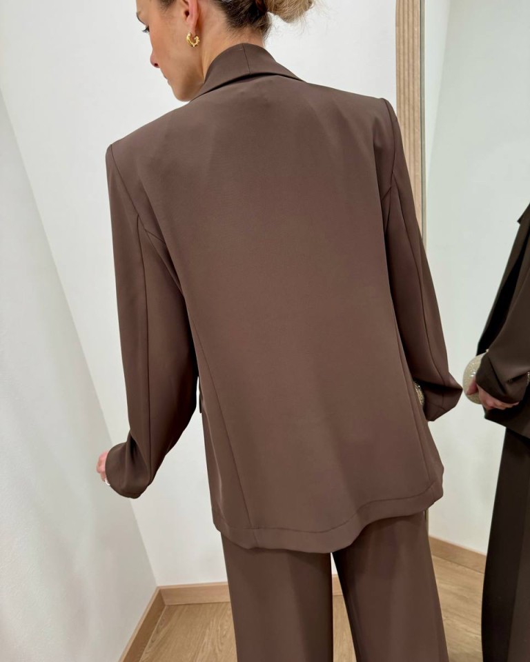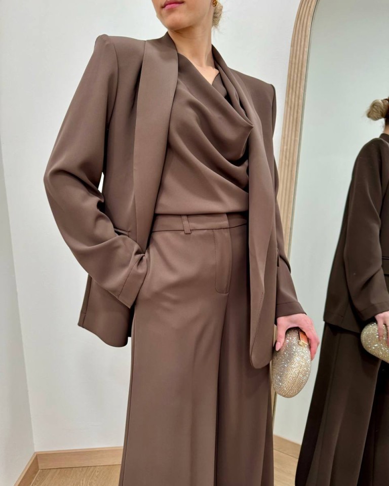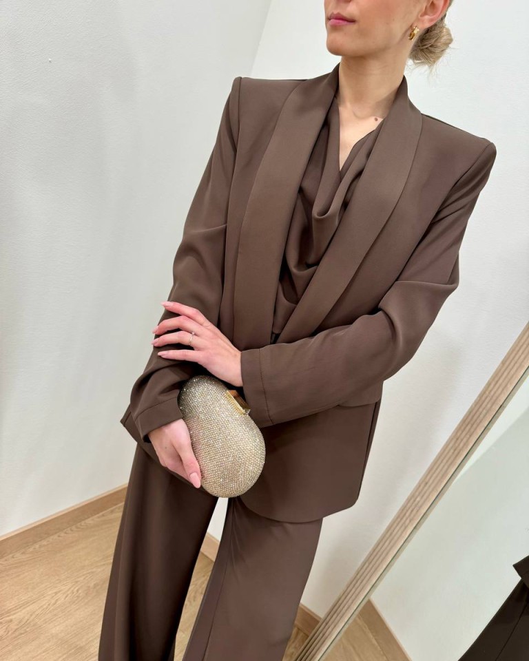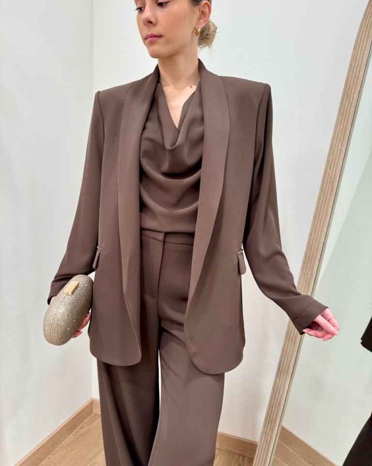 Giacca fluida color moro, modello dritto, monopetto con rever sciallato, senza bottoni, maniche lunghe, tasche con patta. Spalline imbottite, sfoderata. Vestibilità regolare.