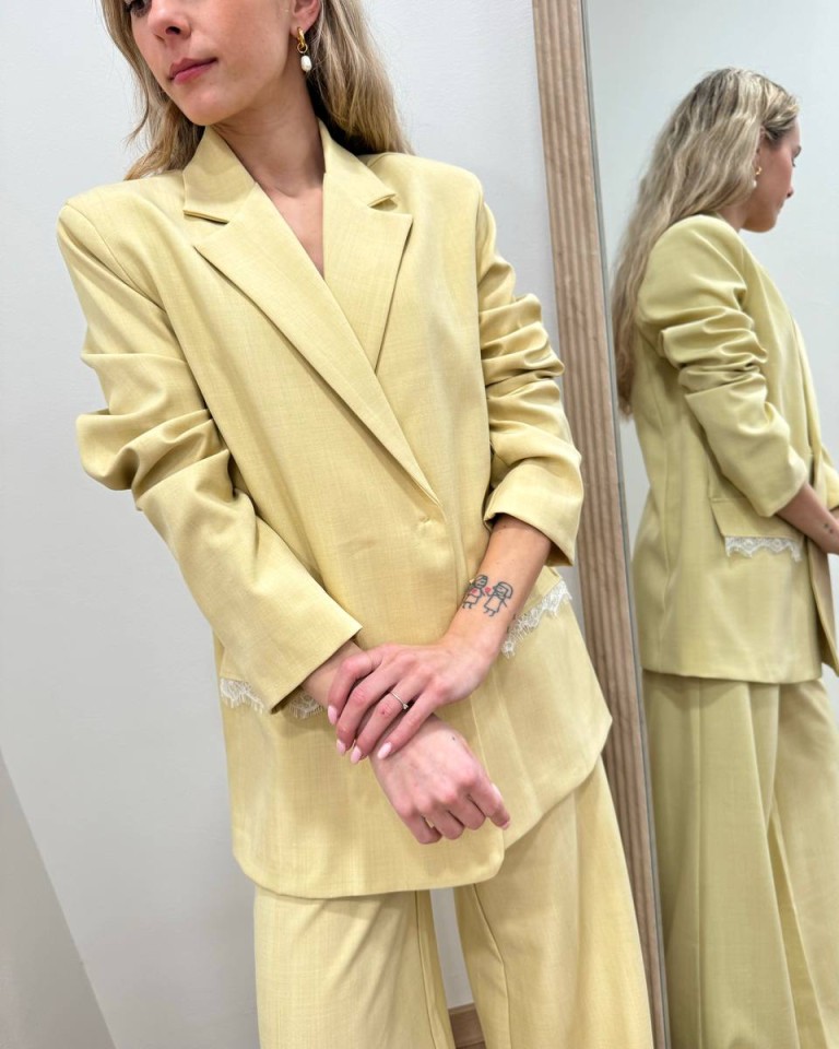 Giacca color giallo pastello con corsetto in pizzo panna abbinato removibile, modello dritto, rever classico, maniche lunghe e spalle imbottite, chiusura con un bottone, tasche con patta con dettaglio pizzo. Foderata. Vestibilità regolare.