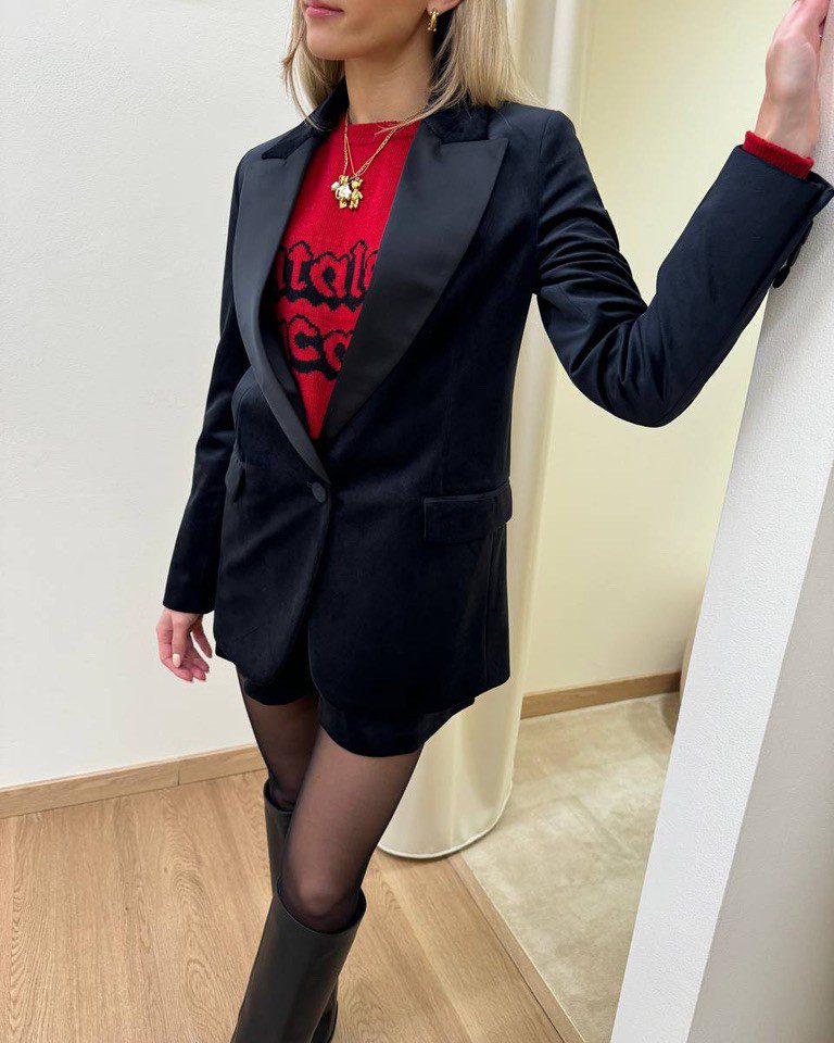 Giacca in velluto nero con rever raso in tono Vicolo