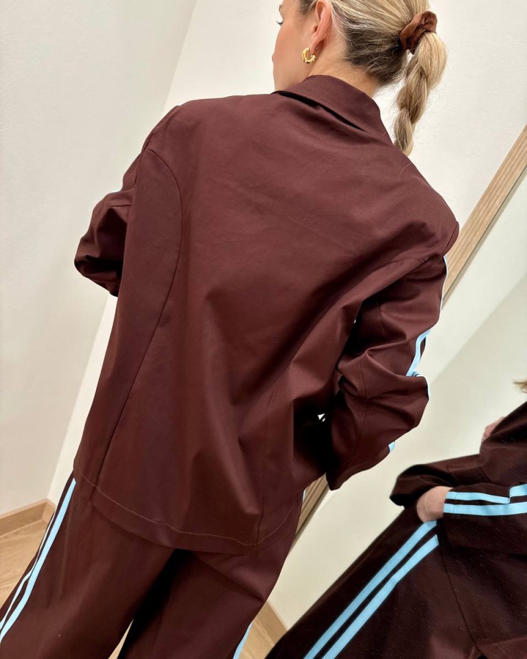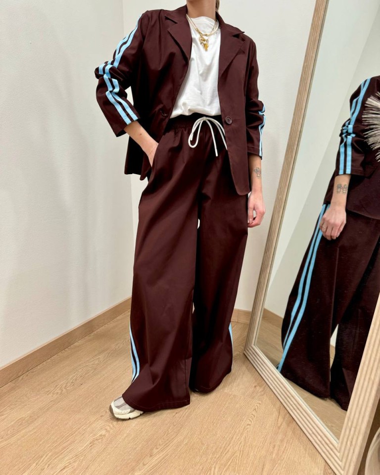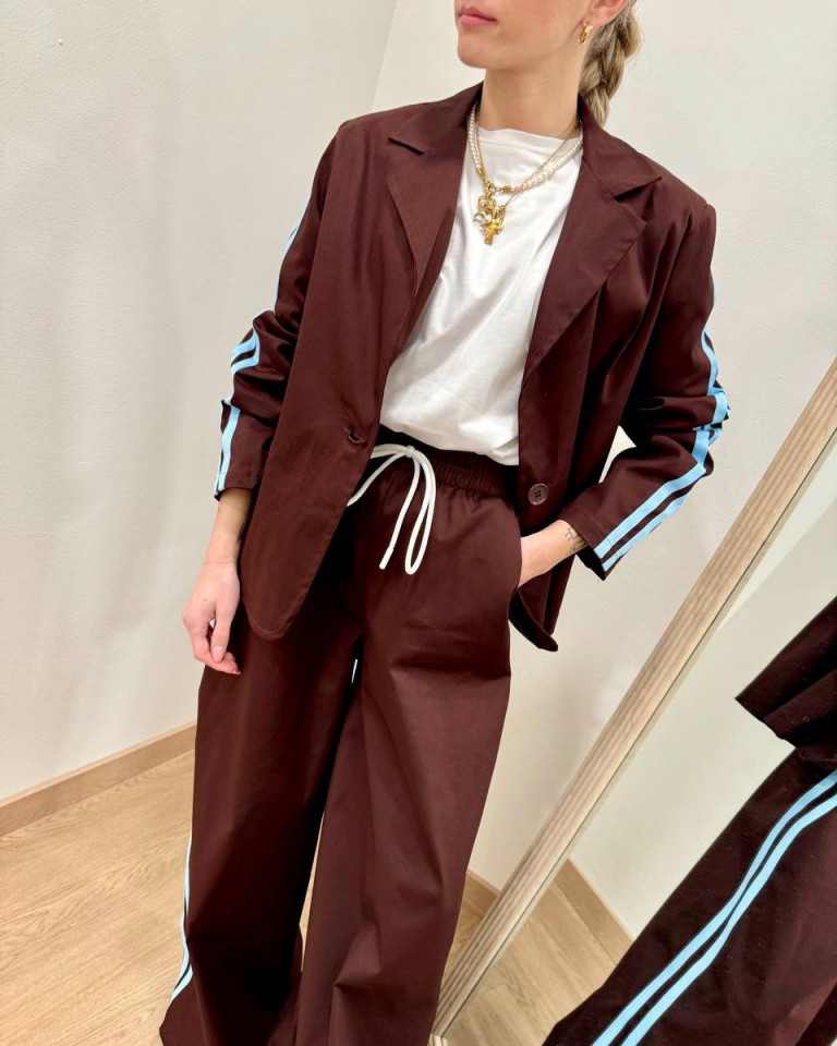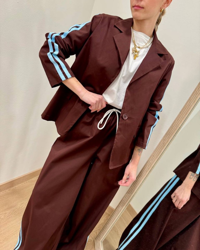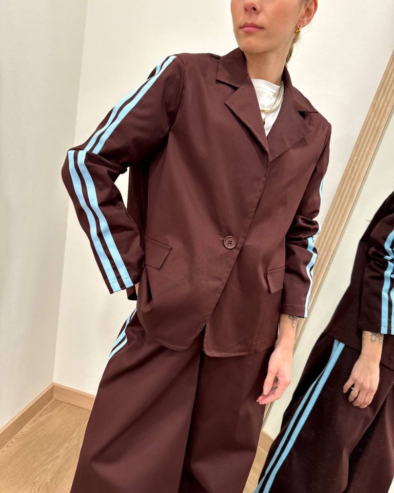 Giacca color moro con bande laterali sulle maniche a contrasto azzurre, modello over, corto, maniche lunghe, rever classico e chiusura con un bottone, tasche finte con patta, sfoderata. Vestibilità ampia.