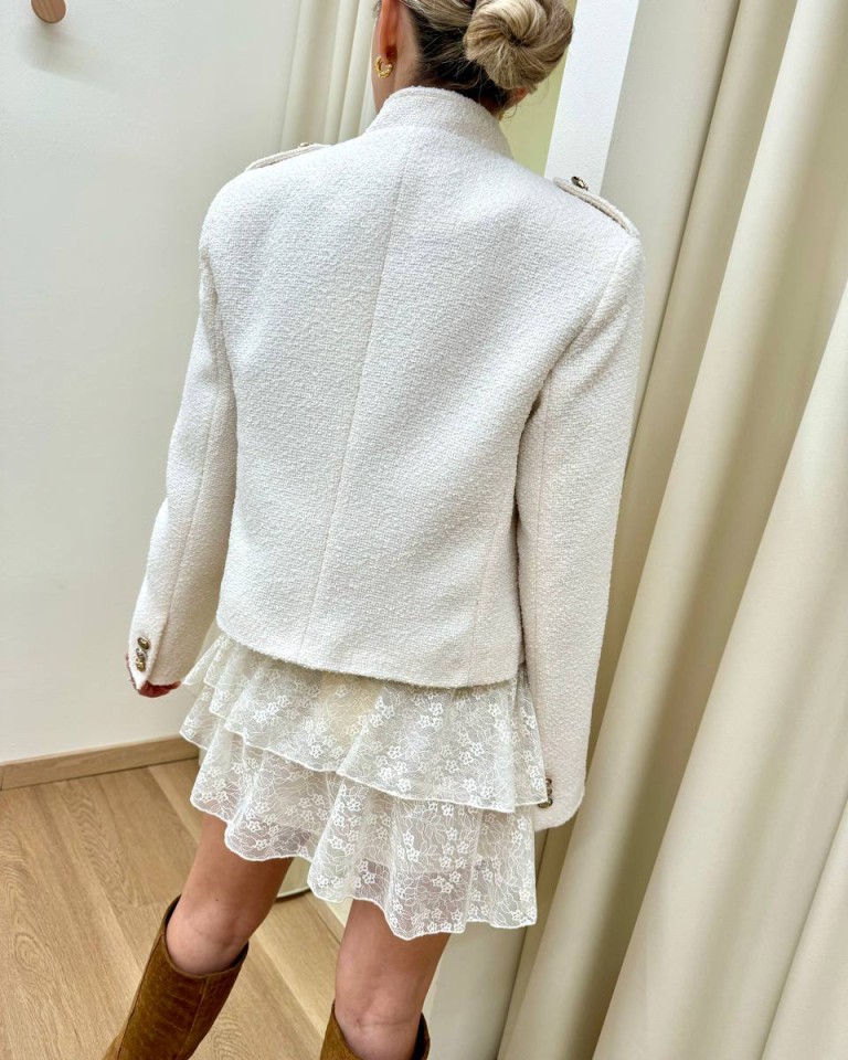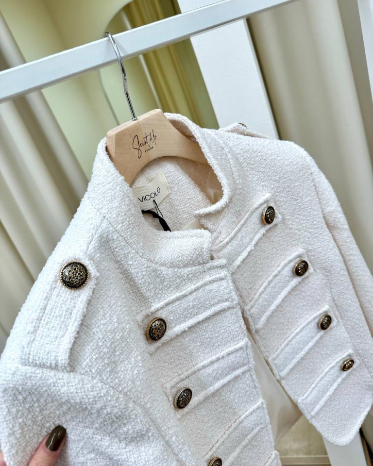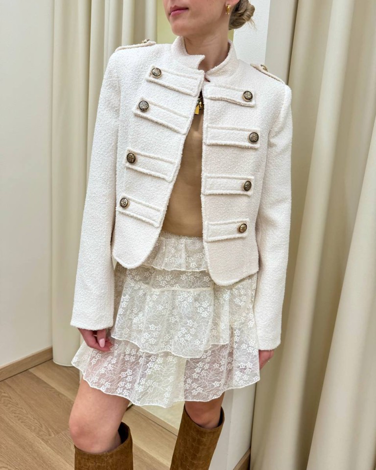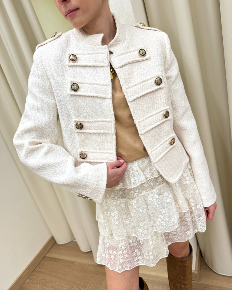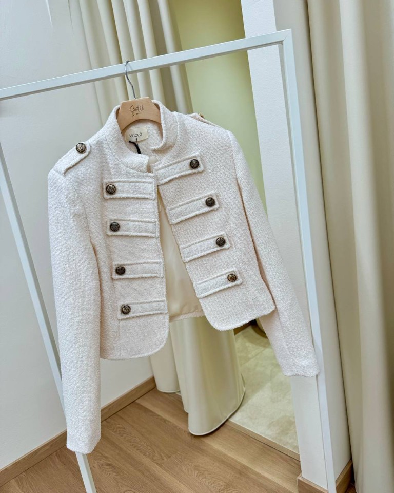 Giacca stile napoleone in bouclè panna, modello dritto corto, maniche lunghe, collo alla coreana, alamari sul davanti e sulle spalle con bottoni in oro brunito lavorati, foderata. Vestibilità regolare.