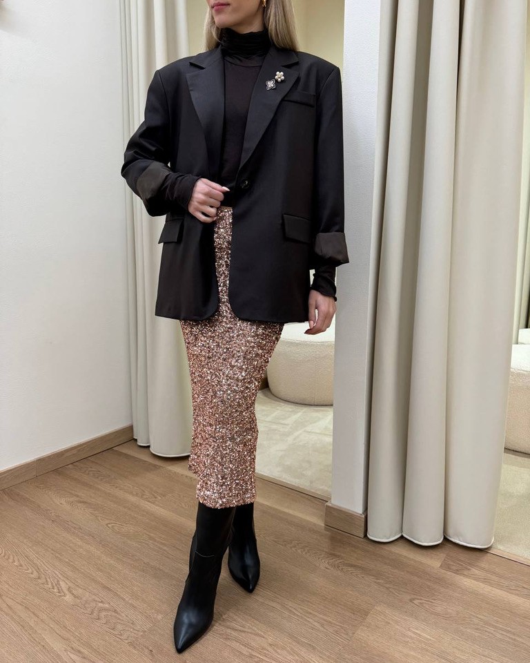 Giacca doppiopetto moro gessata con lurex e guanti Vicolo