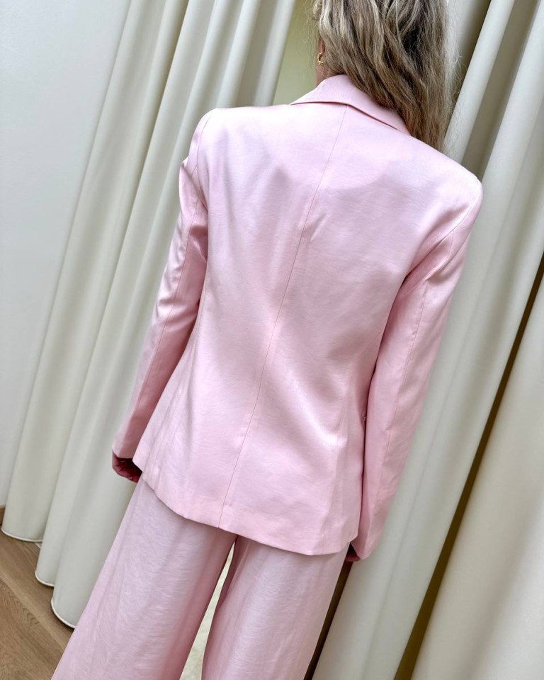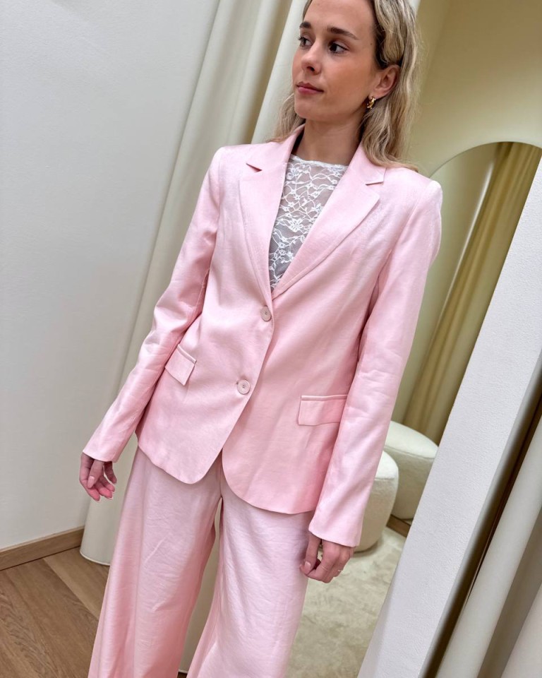 Giacca in tessuto semilucido color rosa chiaro, modello monopetto con rever classico, maniche lunghe, chiusura con due bottoni, tasche finte con patta. Foderata. Vestibilità regolare.