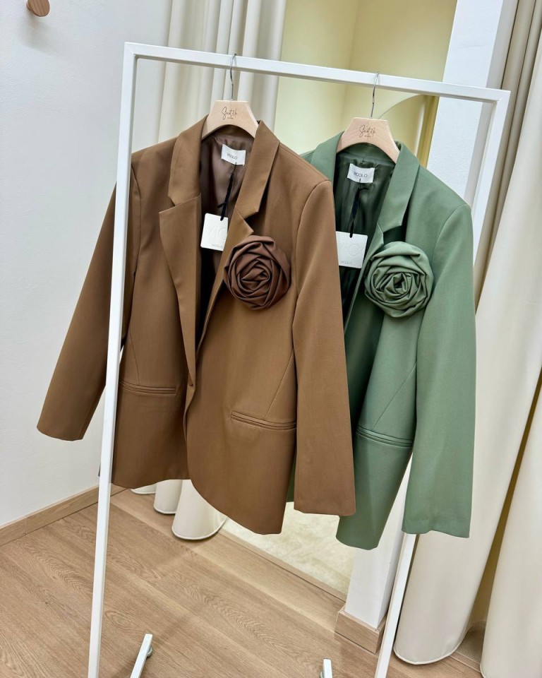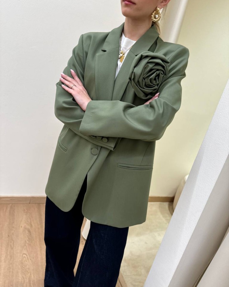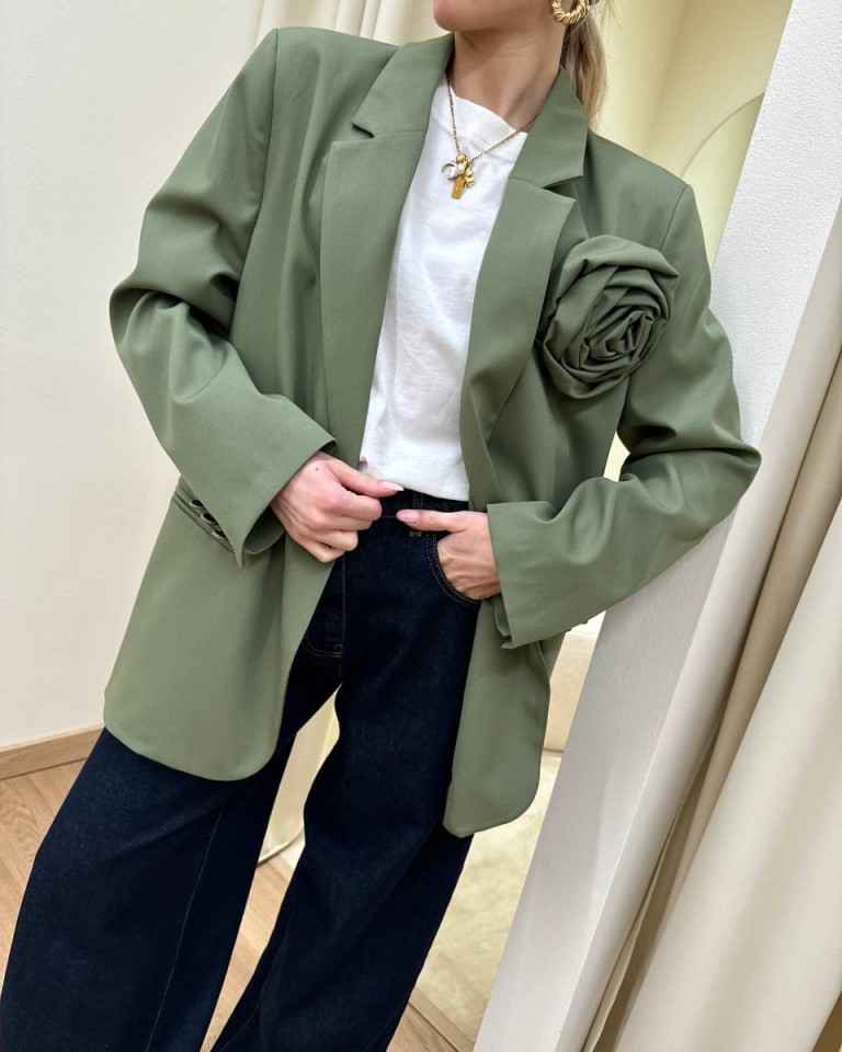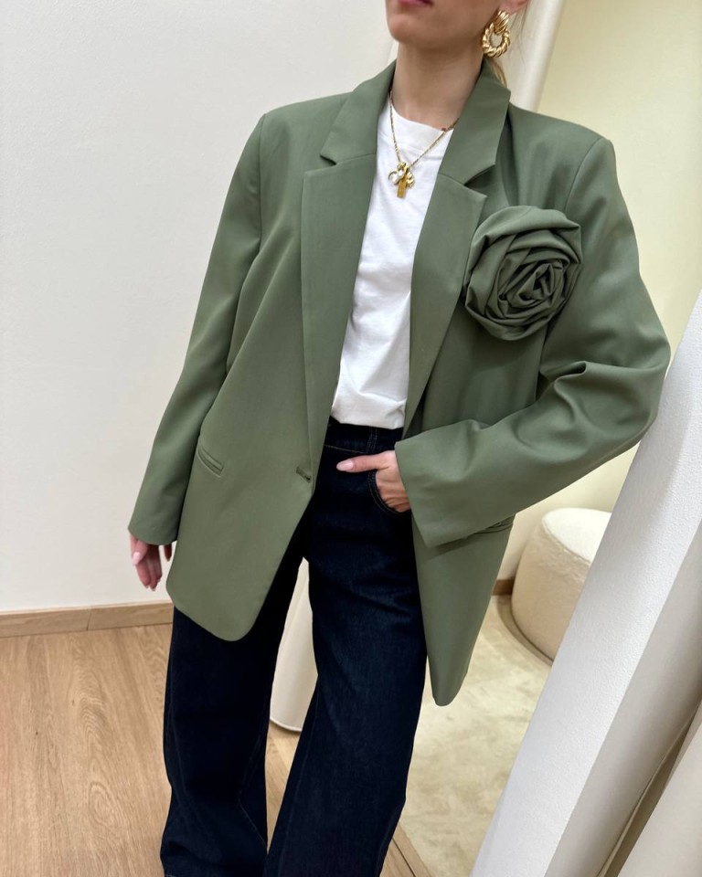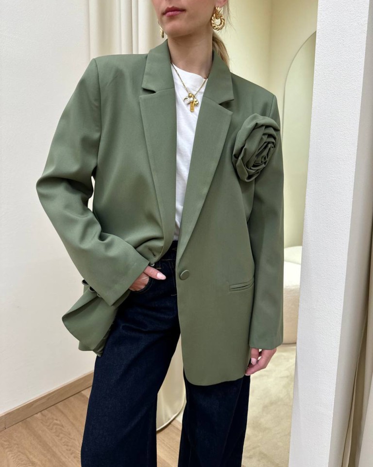 Giacca verde salvia, modello over, rever classico, chiusura con un bottone, maniche lunghe e tasche a filetto, spacco centrale dietro, spilla in tessuto a forma di fiore sul davanti. Foderata. Vestibilità ampia.