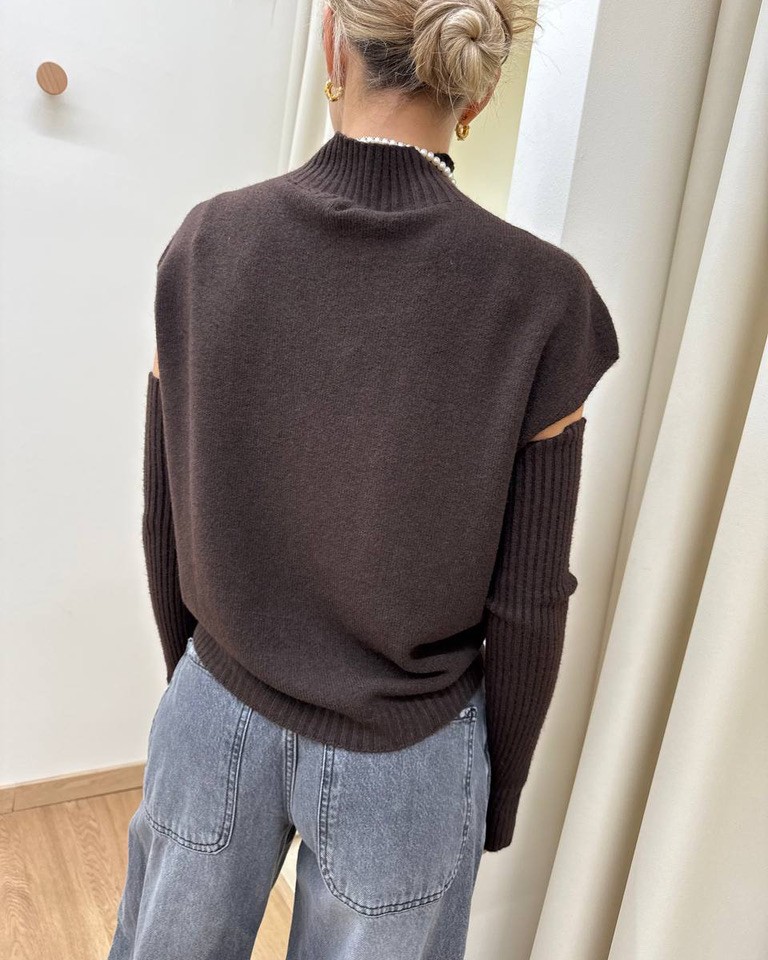 Gilet in maglia rasata color moro con viscosa. Modello over, collo alto, smanicato con manicotti a costine rimovibili. Vestibilità regolare.