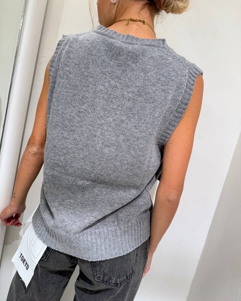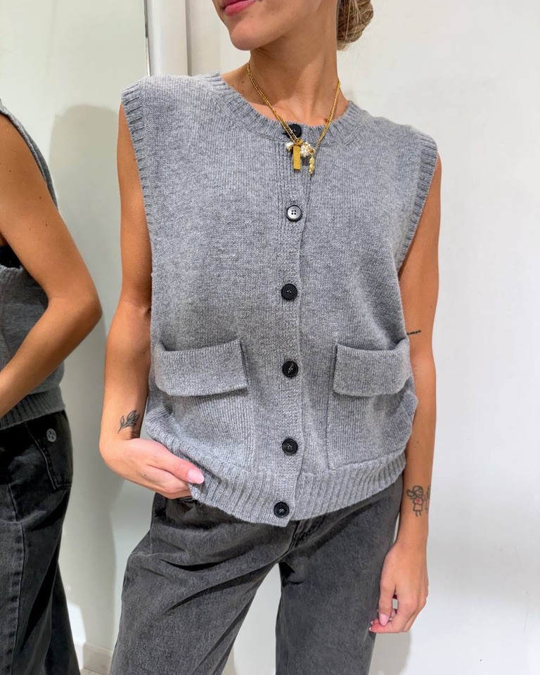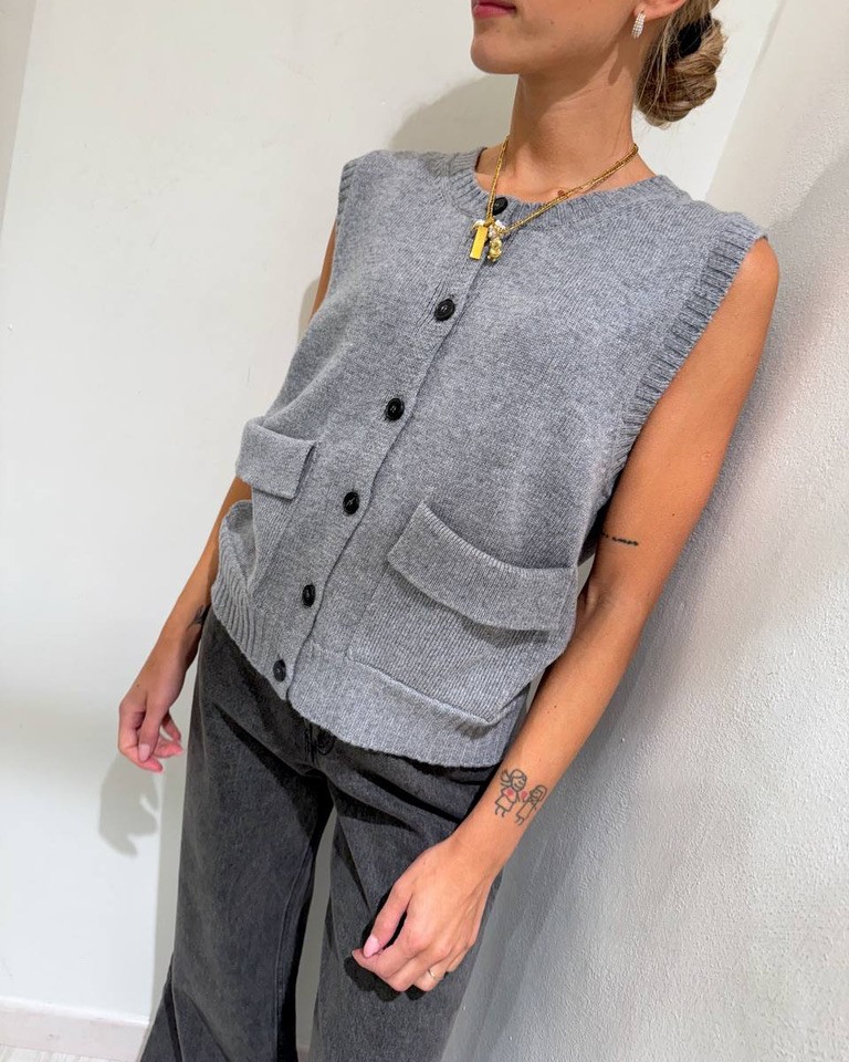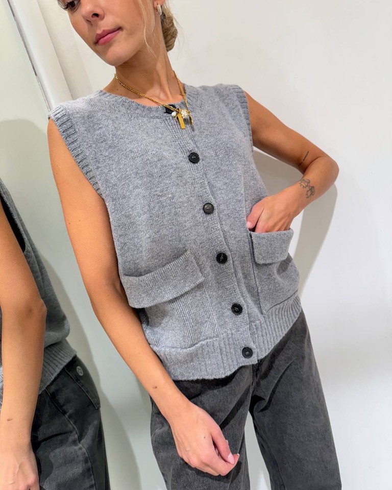 Gilet in maglia color grigio in lana cachemire e viscosa, modello girocollo, smanicato con chiusura frontale con bottoni neri. Tasche laterali applicate con patta ed elastico su profili a coste. Vestibilità regolare.