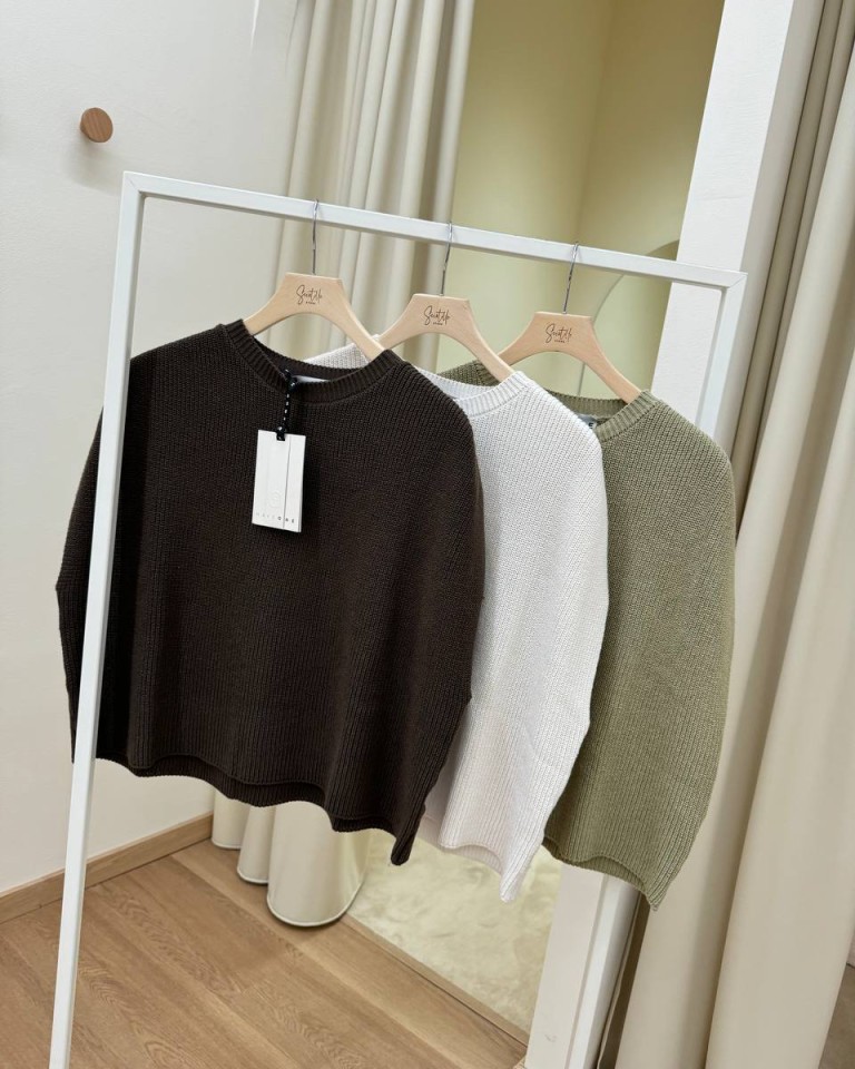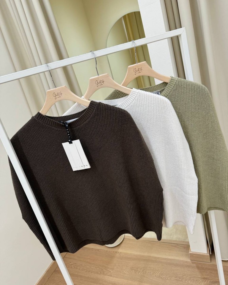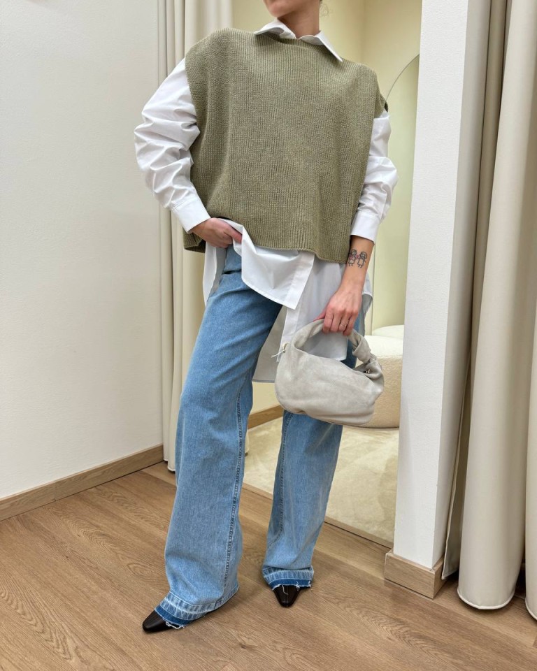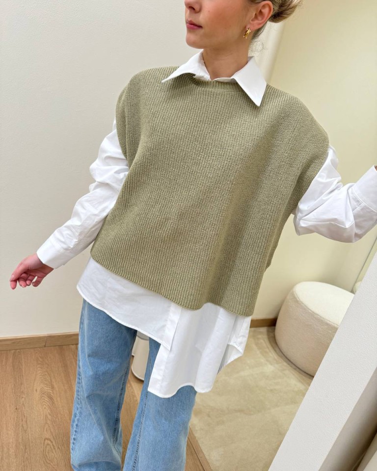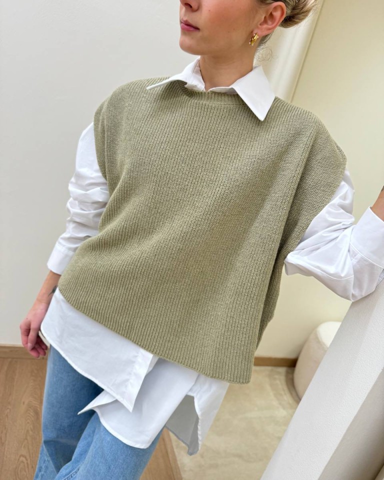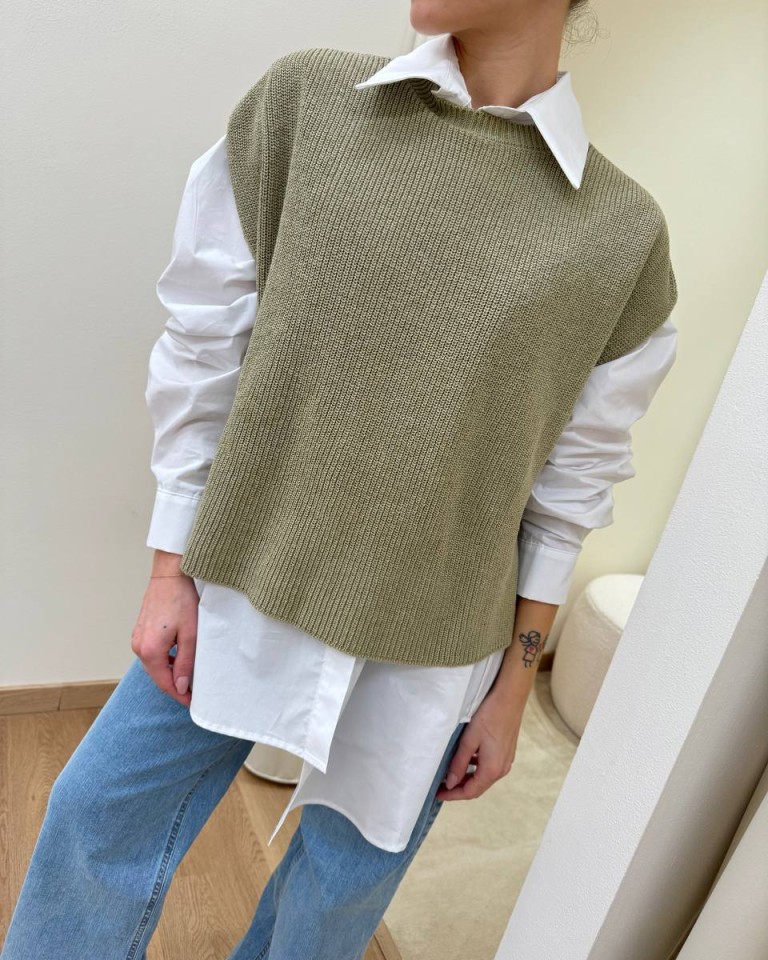 Gilet in maglia inglese kaki, modello over, girocollo, giromanica sceso. Vestibilità ampia.
