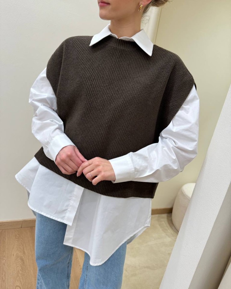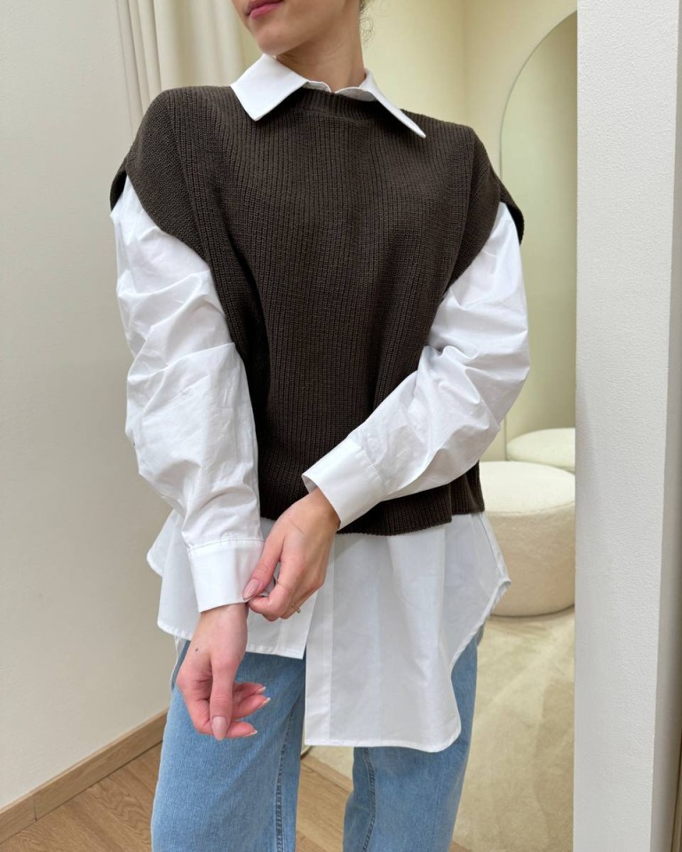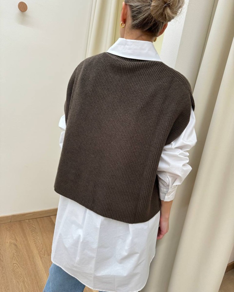 Gilet in maglia inglese moro, modello over, girocollo, giromanica sceso. Vestibilità ampia.