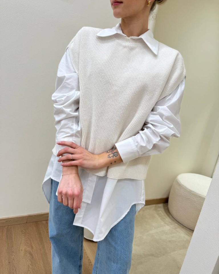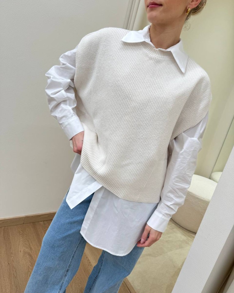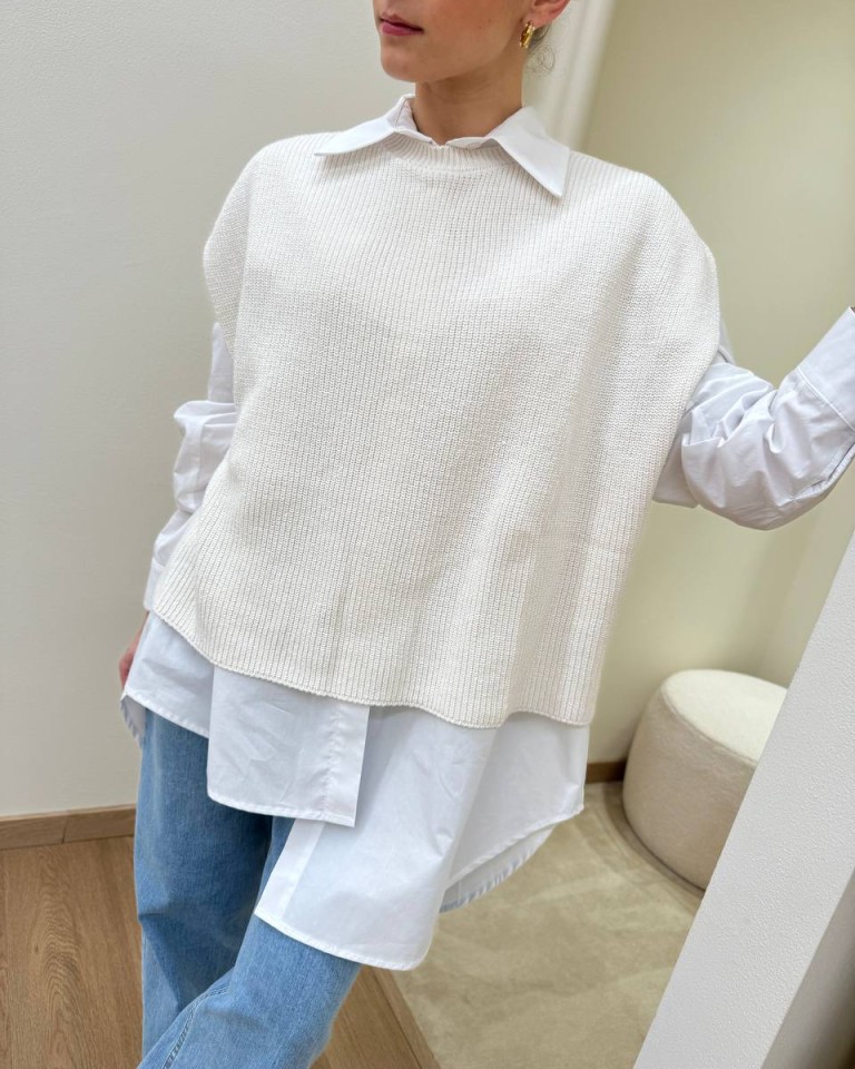 Gilet in maglia inglese panna, modello over, girocollo, giromanica sceso. Vestibilità ampia.