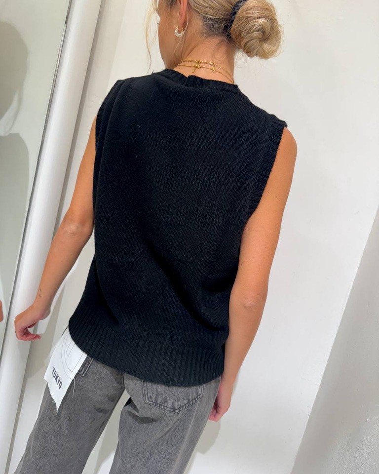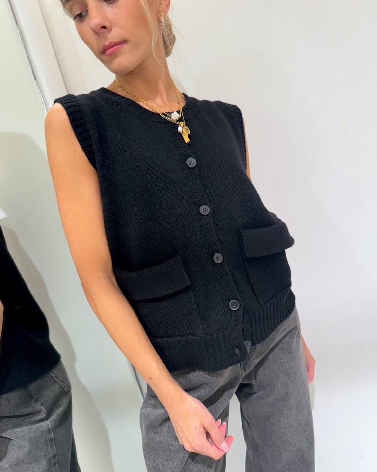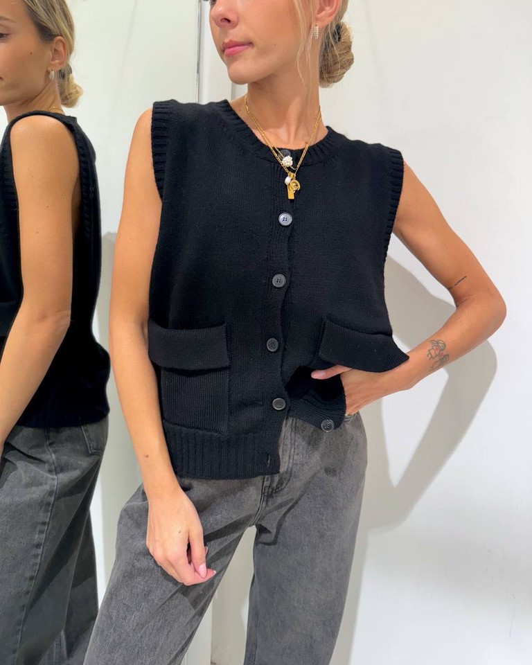 Gilet in maglia color nero in lana cachemire e viscosa, modello girocollo, smanicato con chiusura frontale con bottoni neri. Tasche laterali applicate con patta ed elastico su profili a coste. Vestibilità regolare.