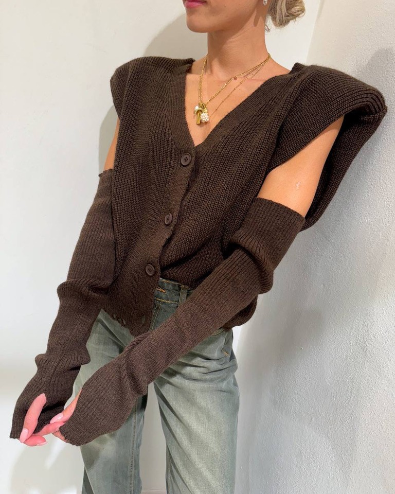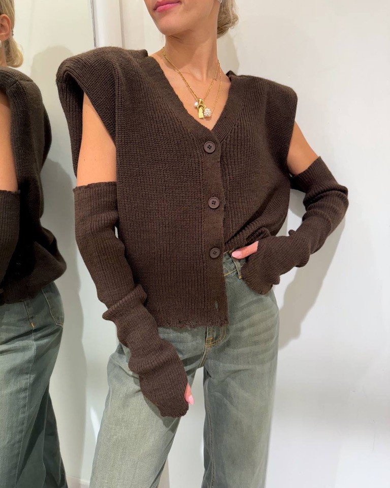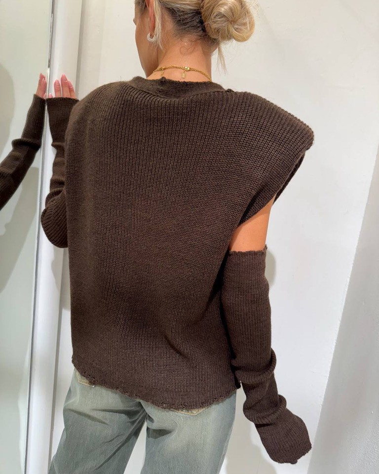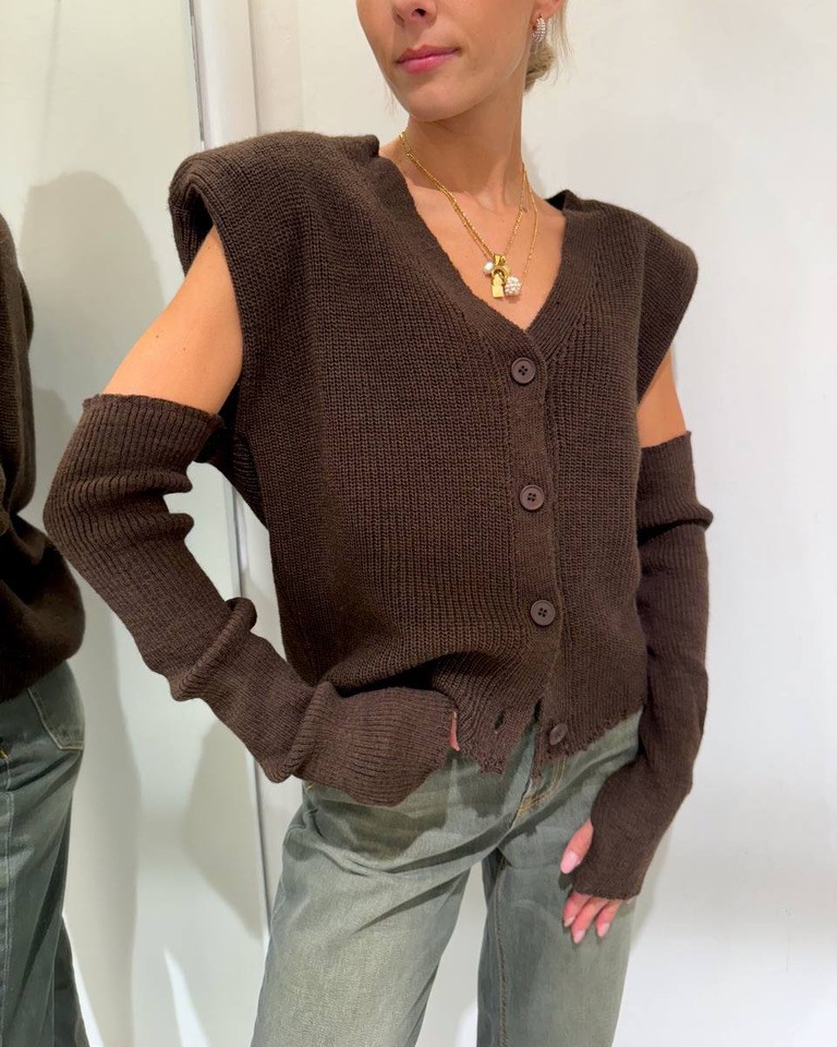 Gilet in maglia inglese color moro in alpaca, lana e viscosa. Modello girocollo, smanicato con spalle imbottite e manicotti rimovibili. Chiusura frontale con bottoni neri. Dettagli con rotture sui profili. Vestibilità regolare.