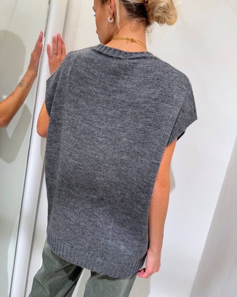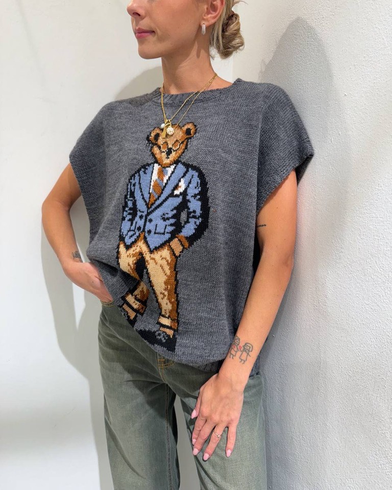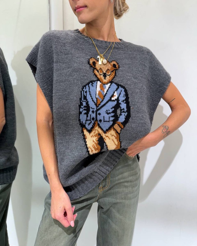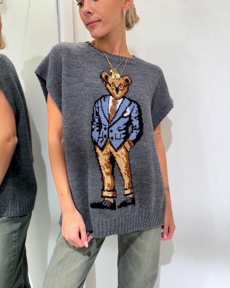 Gilet in maglia color grigio con orsetto frontale in viscosa, lana ed alpaca, modello oversize, girocollo, smanicato con giro manica ampio. Elastico a coste larghe su collo e fondo. Vestibilità ampia.