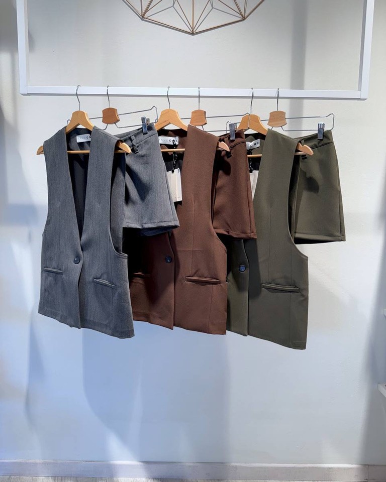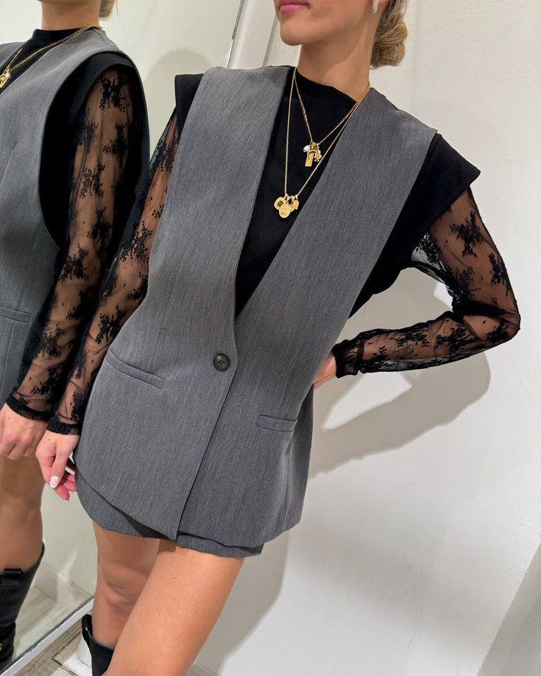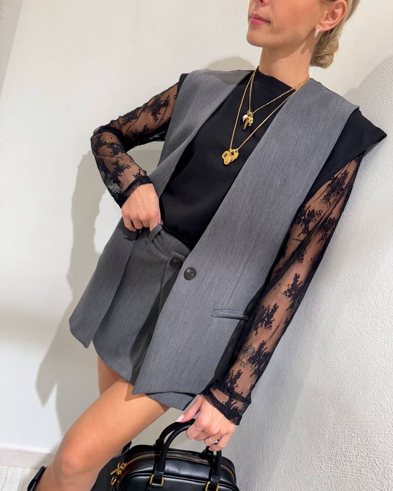 Gilet color grigio melange, modello oversize, scollo a v profondo, giro manica ampio e chiusura frontale con un bottone. Tasche laterali a filetto e spacci laterali. Vestibilità dritta.