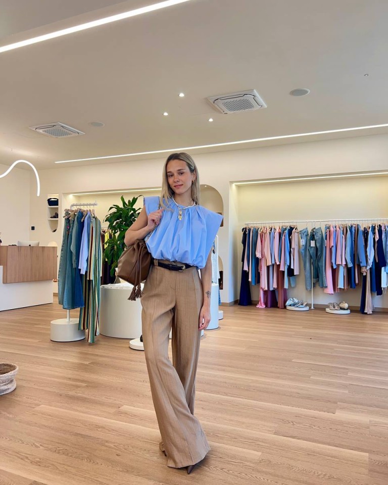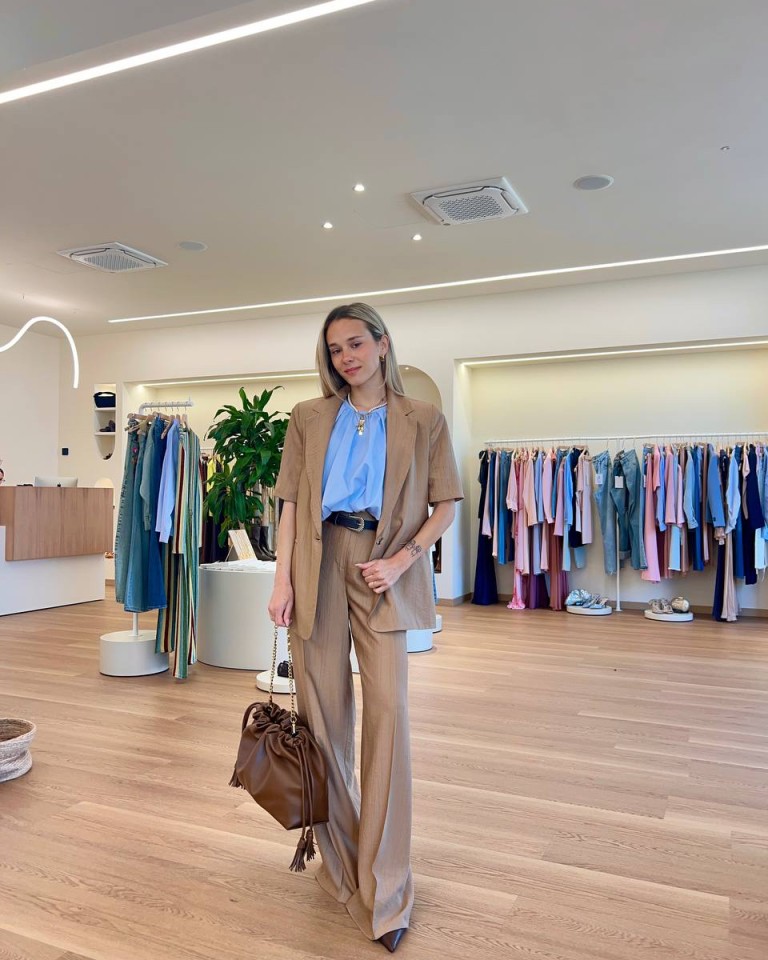 Un completo beige dal taglio morbido e rilassato, composto da blazer fluido e pantaloni ampi che scivolano lungo la figura senza costringerla. Il top azzurro sotto illumina il look e crea un contrasto delicato ma raffinato. Gli accessori restano coerenti con la palette calda, con una borsa marrone strutturata che aggiunge un tocco classico. È un outfit perfetto per contesti semi-formali o lavorativi, dove si vuole apparire curati senza rinunciare al comfort.