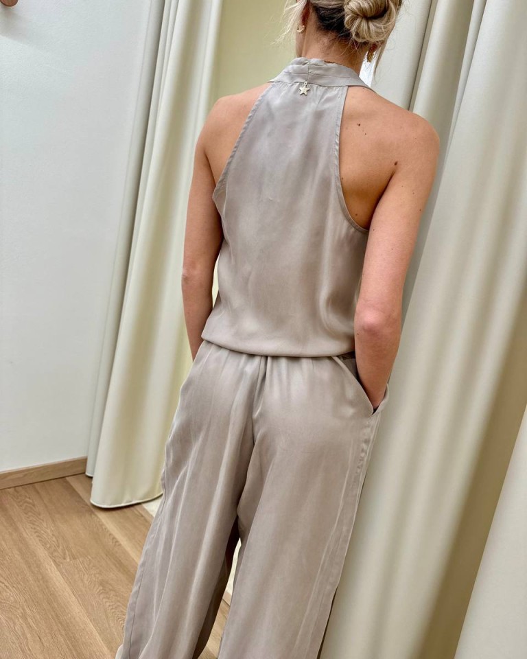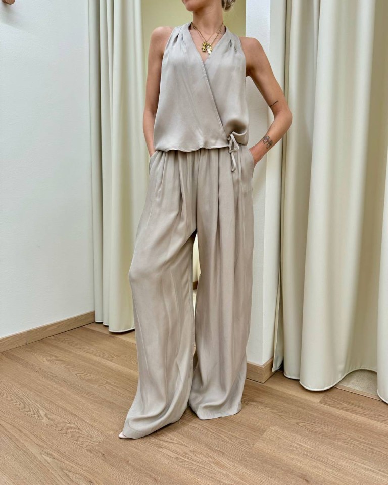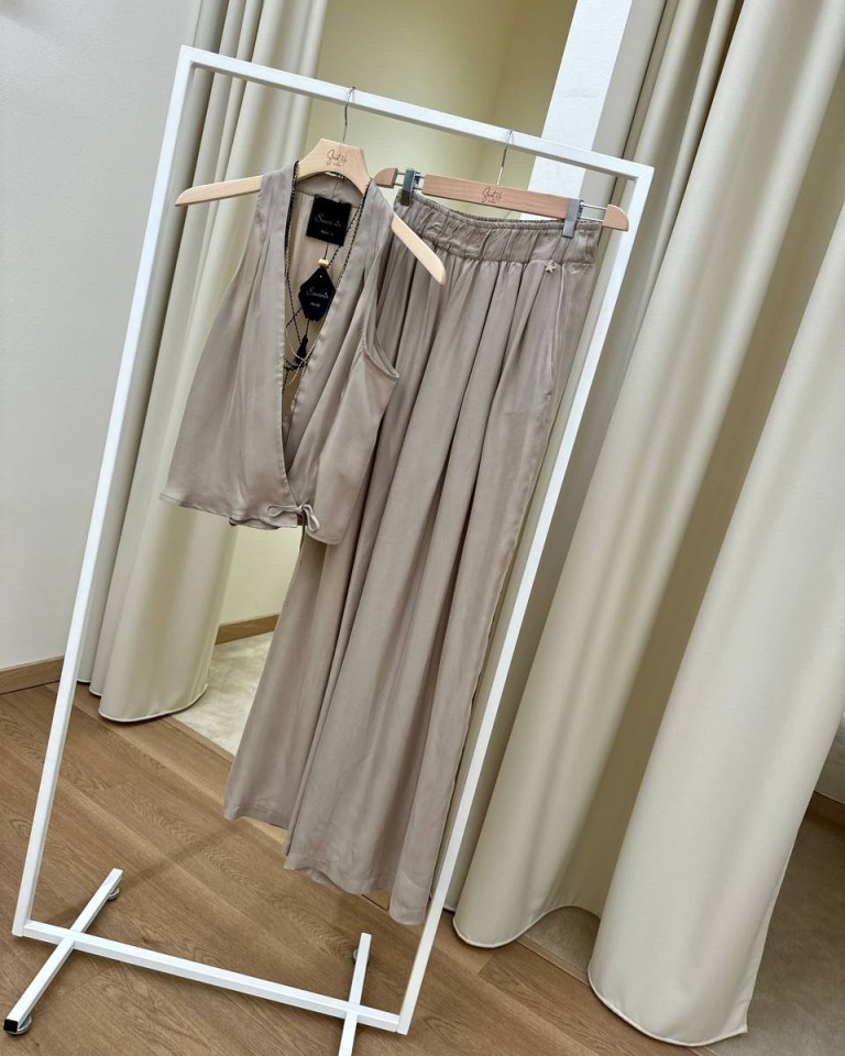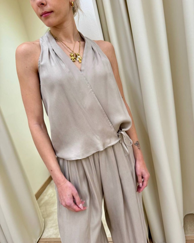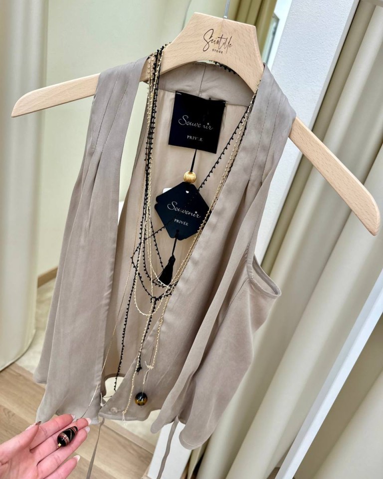 Gilet in tessuto fluido color sabbia, modello a portafoglio con scollo all’americana e chiusura con laccio e bottoni interni, collana abbinata. Vestibilità regolare.