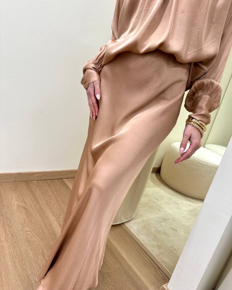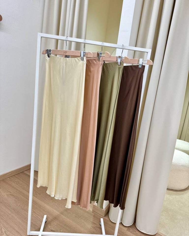 Gonna in raso di viscosa color rosa cipria, modello midi, elastico in vita svasata sul fondo. Vestibilità regolare.