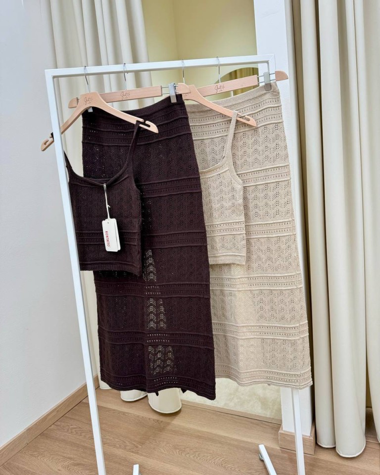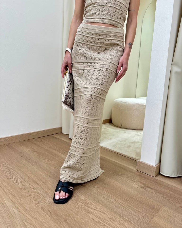 Gonna traforata beige, modello midi aderente, dritto con elastico in vita e spacco centrale sul dietro. Vestibilità aderente ed elasticizzata.