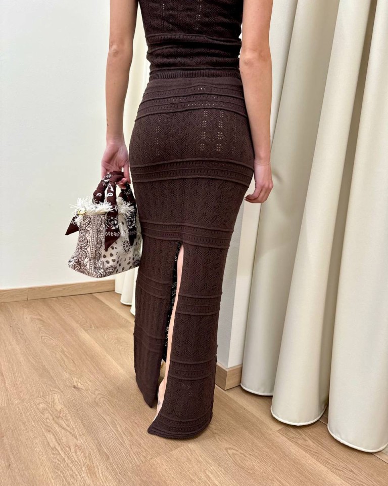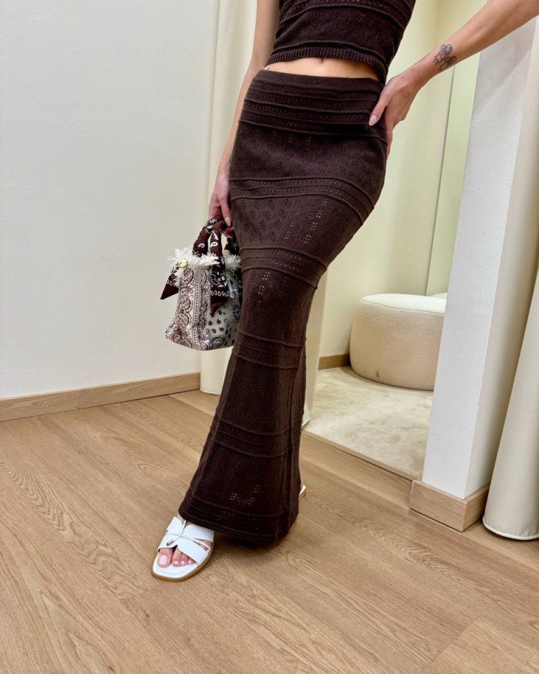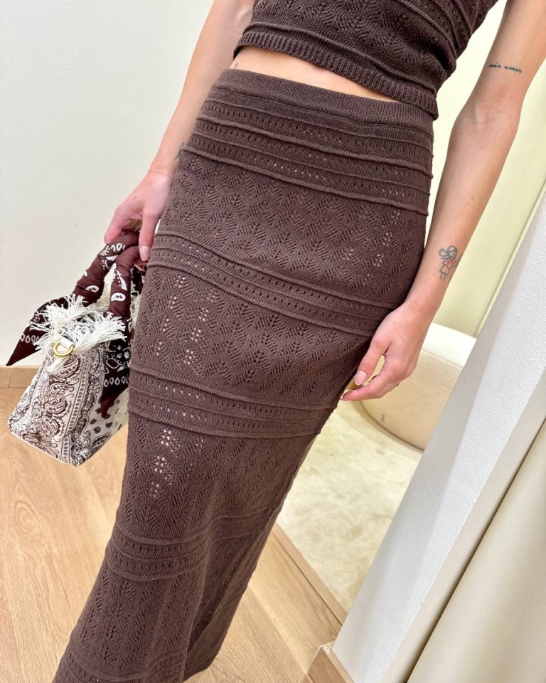 Gonna traforata moro, modello midi aderente, dritto con elastico in vita e spacco centrale sul dietro. Vestibilità aderente ed elasticizzata.