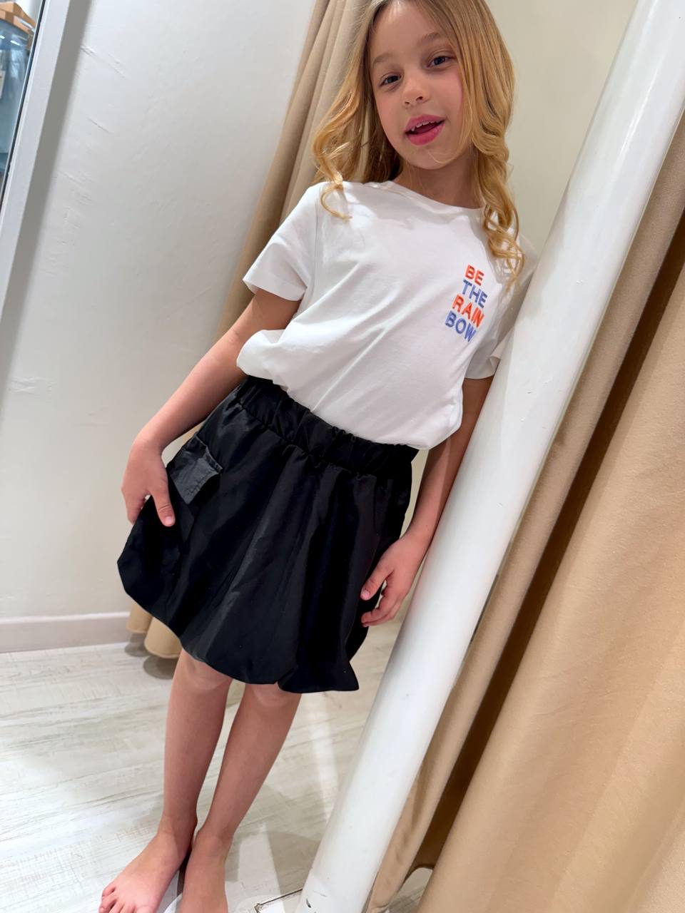 Gonna nera in cotone, modello a palloncino con tasche laterali con patta e fascia elastica in vita. Vestibilità morbida.