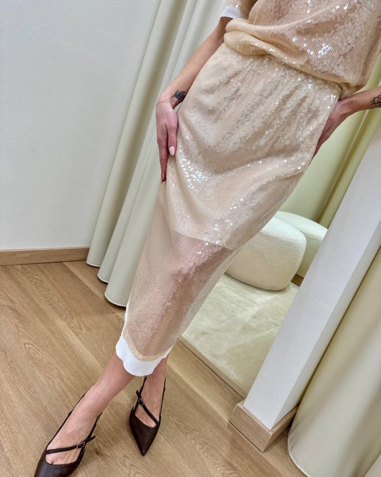 Gonna semitrasparente beige ricoperta da paillettes, modello longuette a vita alta con elastico, spacco dietro, bordino in tessuto bianco, sottogonna bianca. Vestibilità regolare.