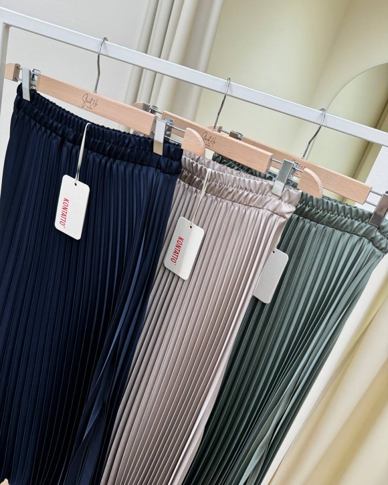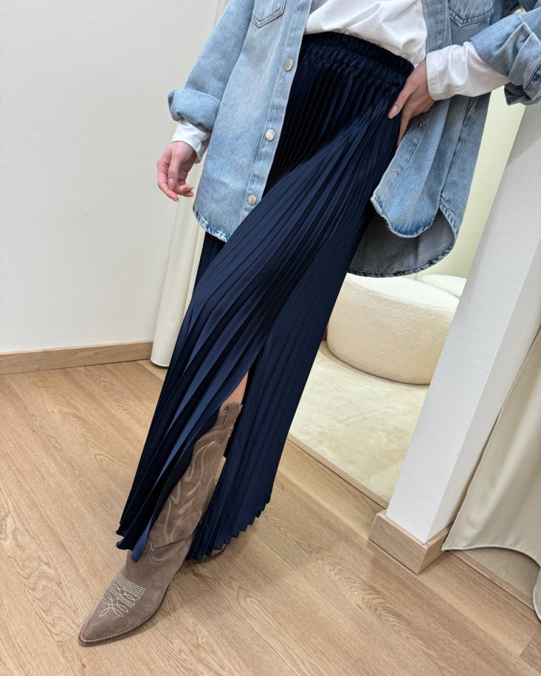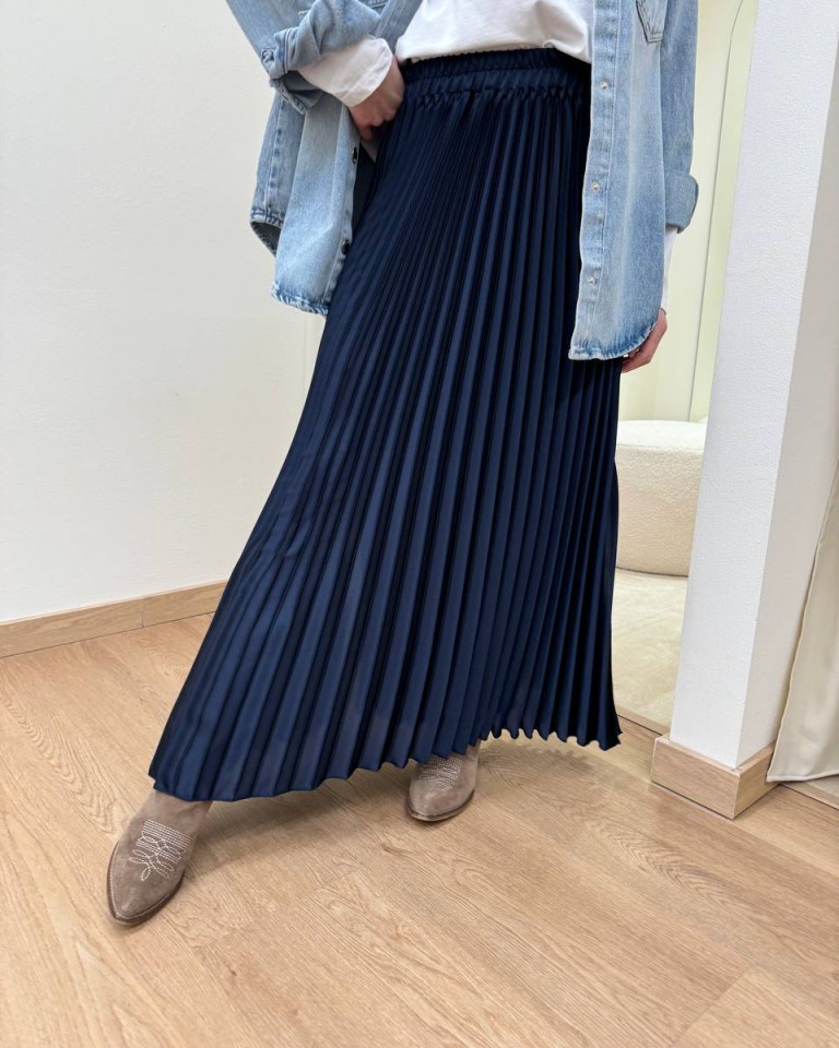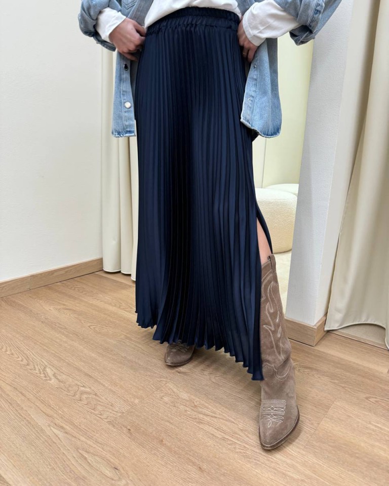 Gonna plisse in raso blu, modello lungo, dritto, vita medio alta con elastico e fondo con spacchi laterali. Vestibilità regolare.