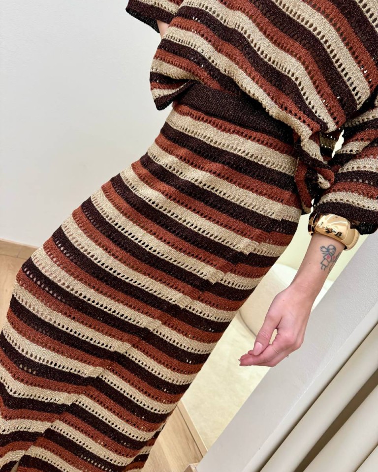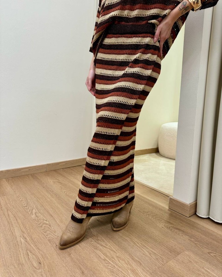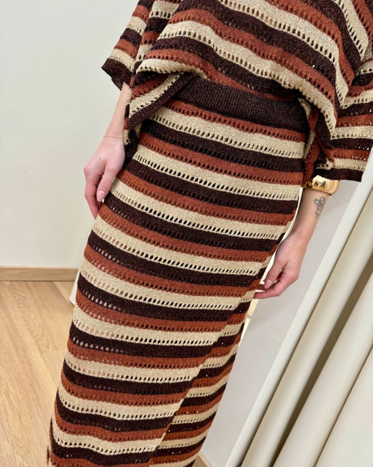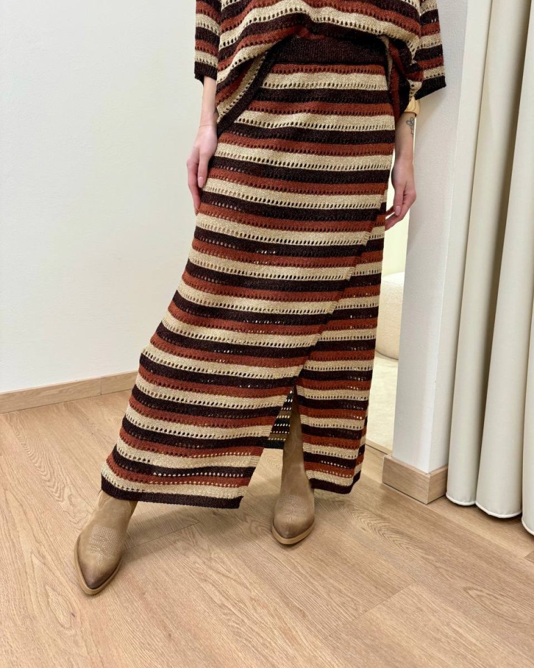 Gonna in maglia traforata con lurex a righe moro, cioccolato, beige e ruggine. Modello midi a portafoglio, vita alta con elastico. Vestibilità dritta regolare.