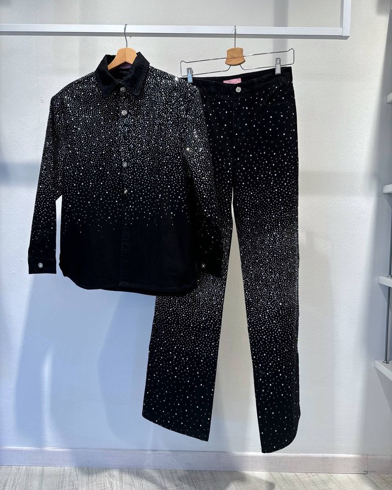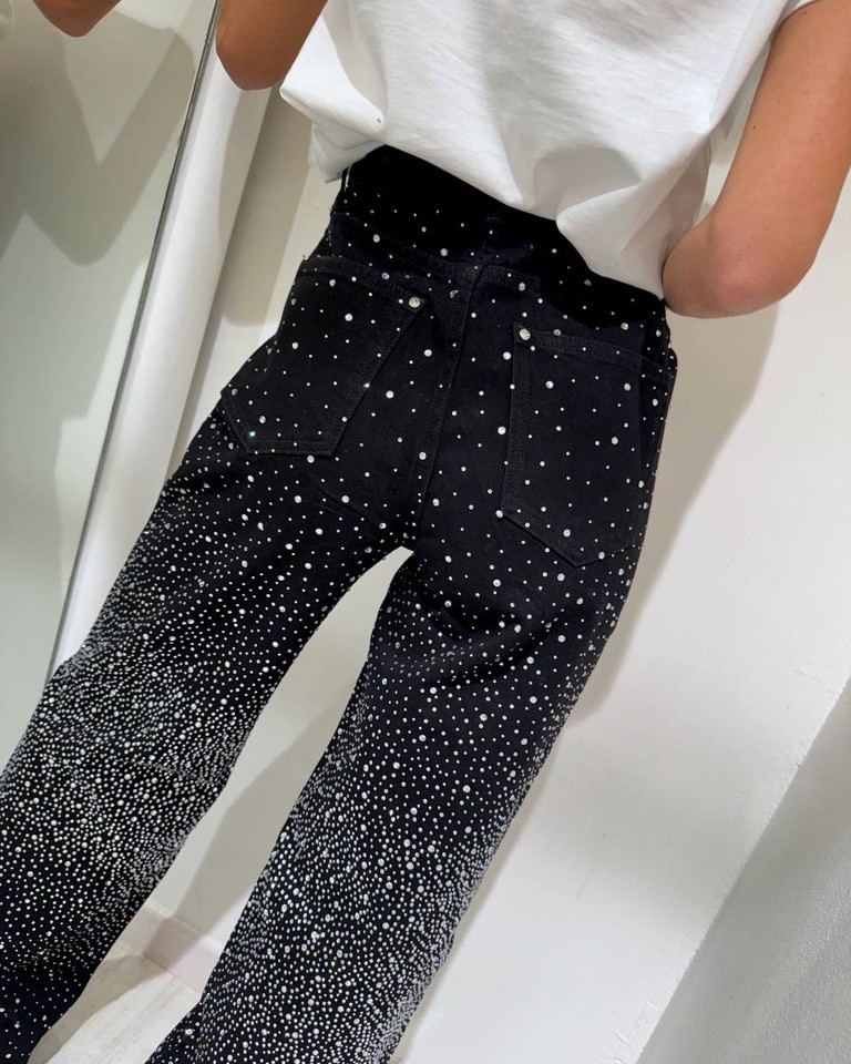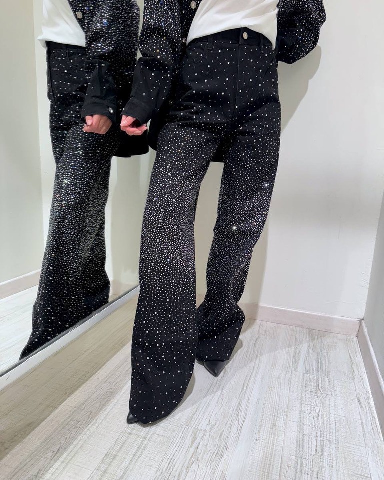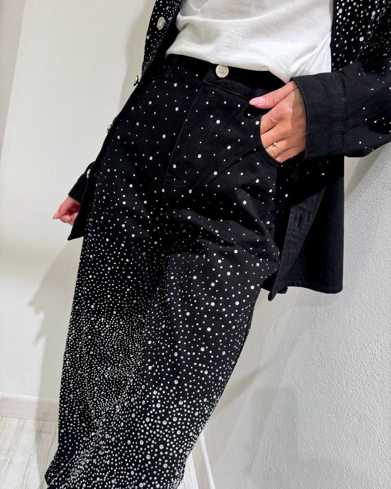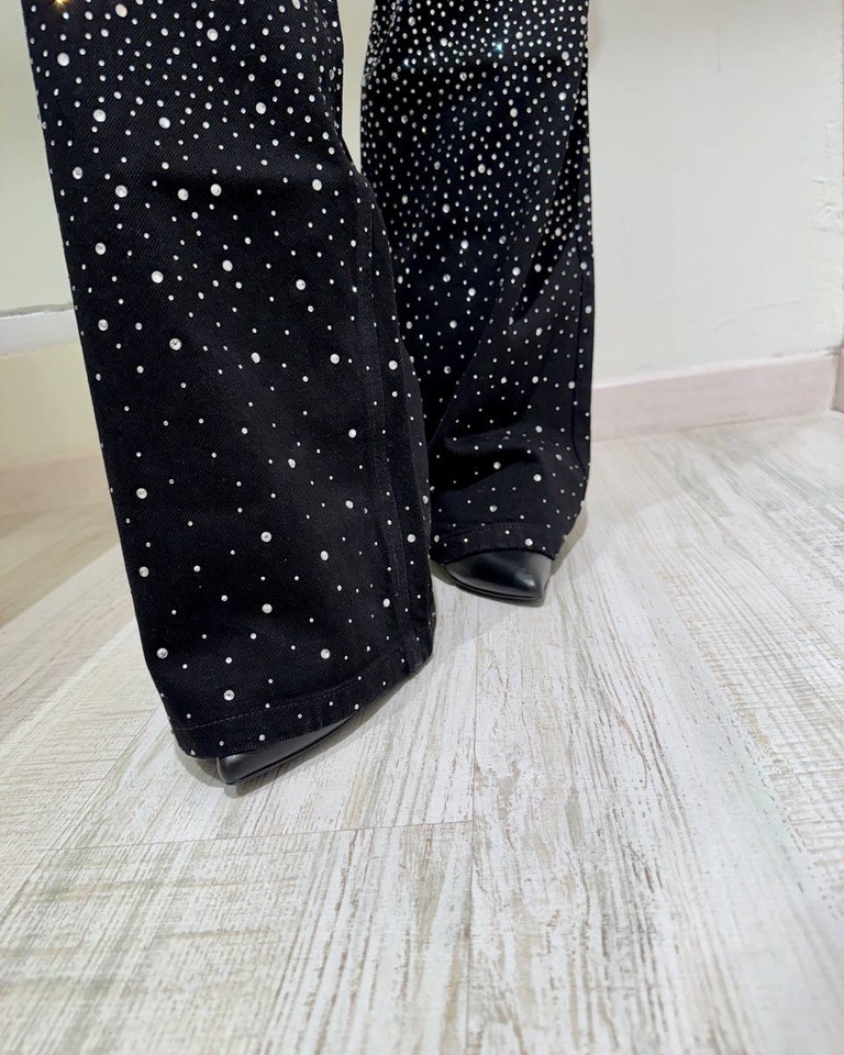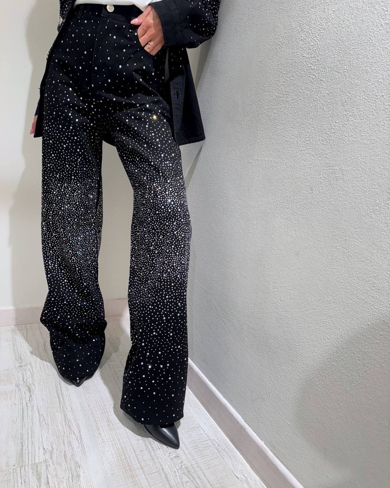 Jeans lavaggio nero ricoperto da strass argento sfumati, modello palazzo, vita alta con chiusura zip e bottone. Tasche laterali. Vestibilità non elasticizzata, gamba lunga.