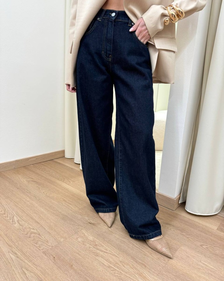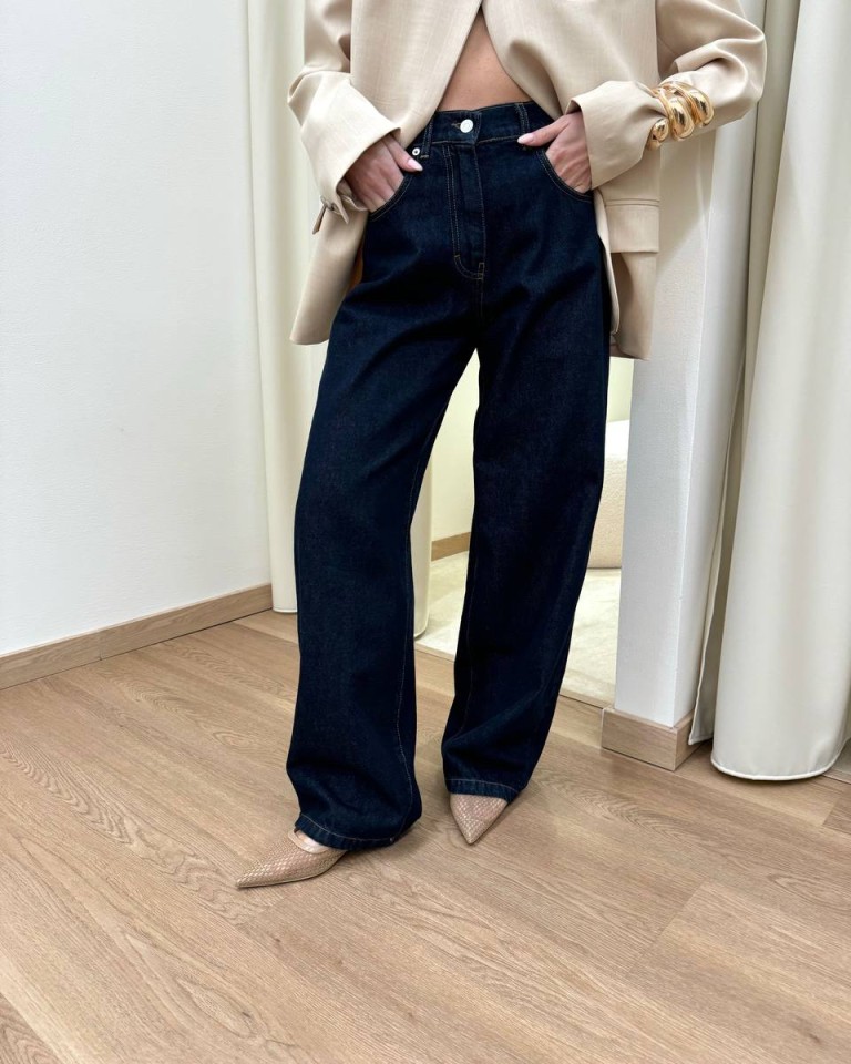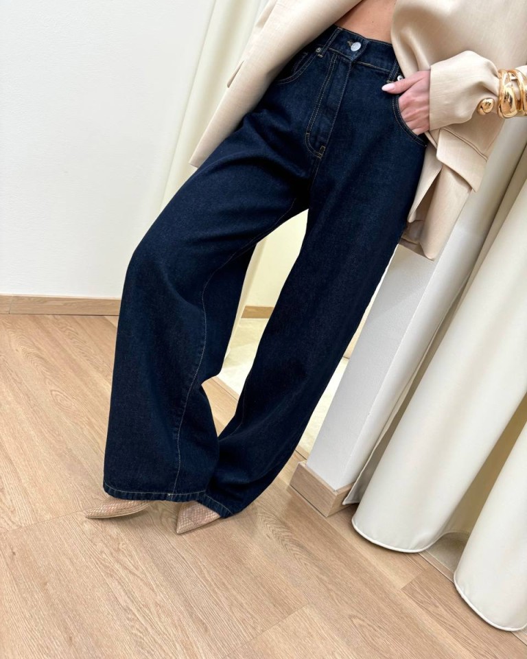 Jeans “bella” lavaggio blu scuro con cuciture a contrasto, modello gamba larga e dritta, vita medio alta e chiusura frontale con zip e bottone. Tasche laterali. Vestibilità grande (se si oscilla tra due taglie consigliamo di acquistare la taglia più piccola).