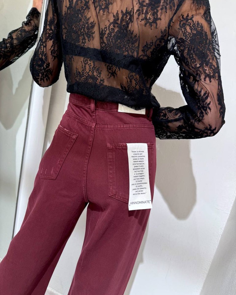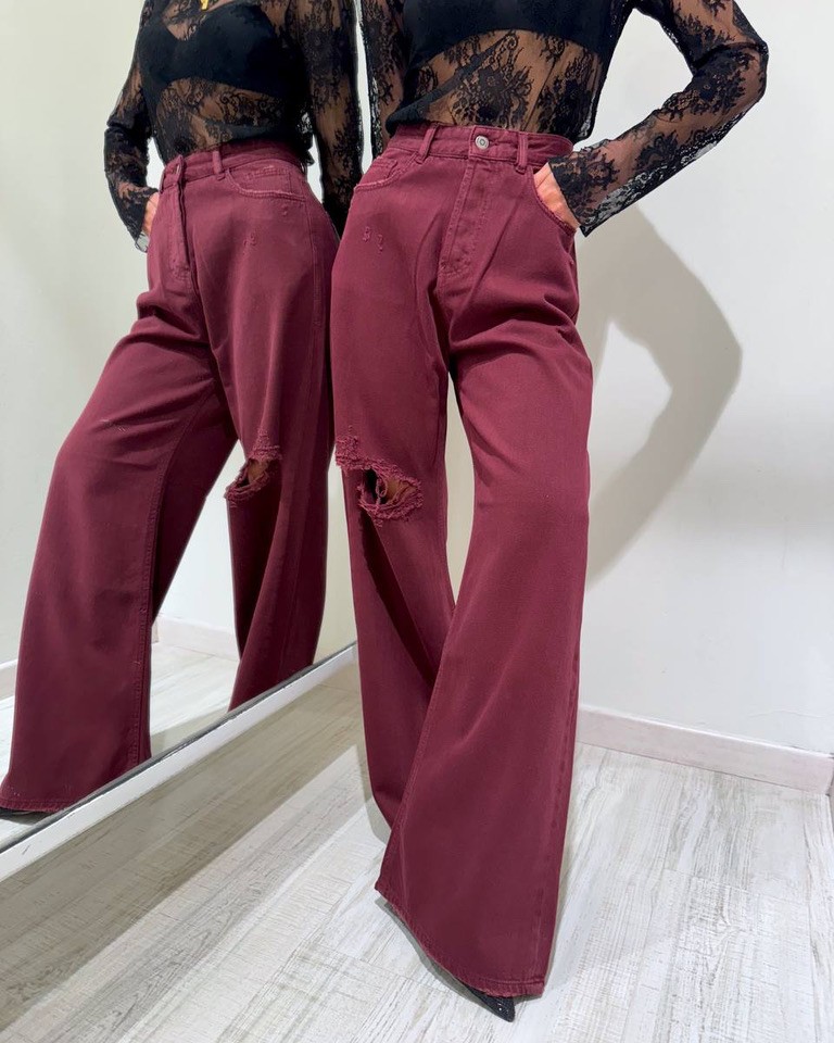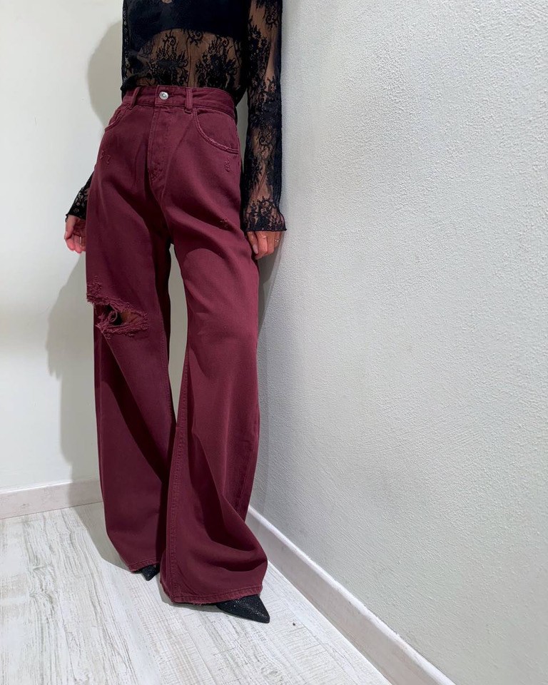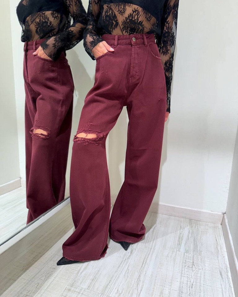 Jeans lavaggio bordeaux in bull con dettagli rotture, modello dritto, vita alta con chiusura frontale con zip e bottoni, tasche laterali. Vestibilità ampia.