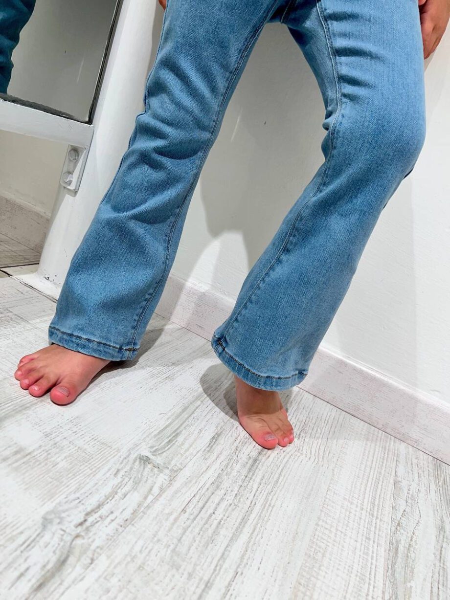 Jeans lavaggio chiaro, modello elasticizzato a zampa, vita media regolabile con chiusura con zip e bottone e tasche laterali. Vestibilità regolare.