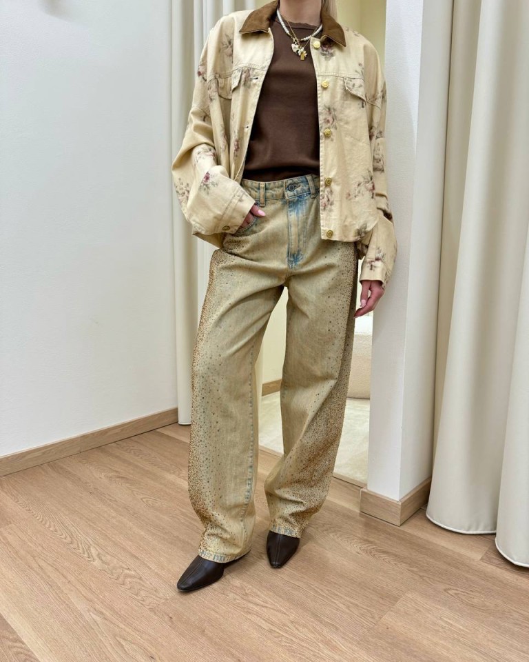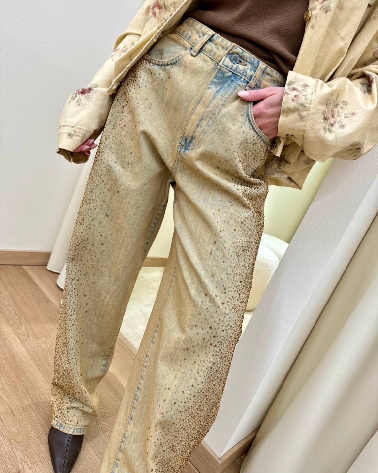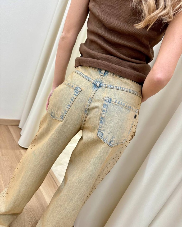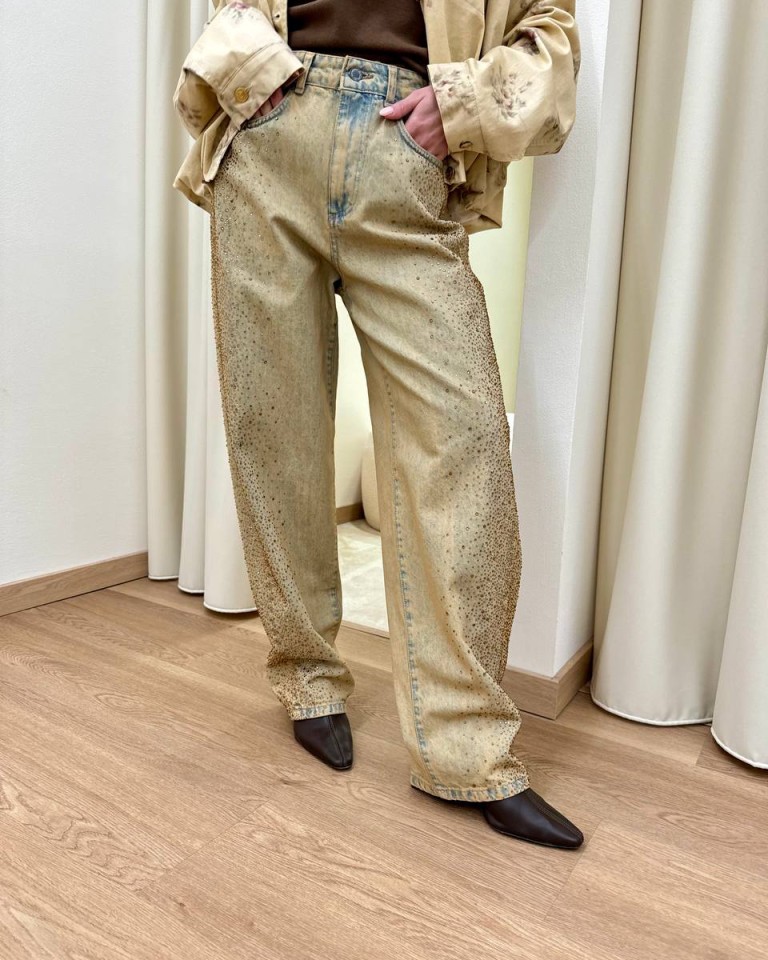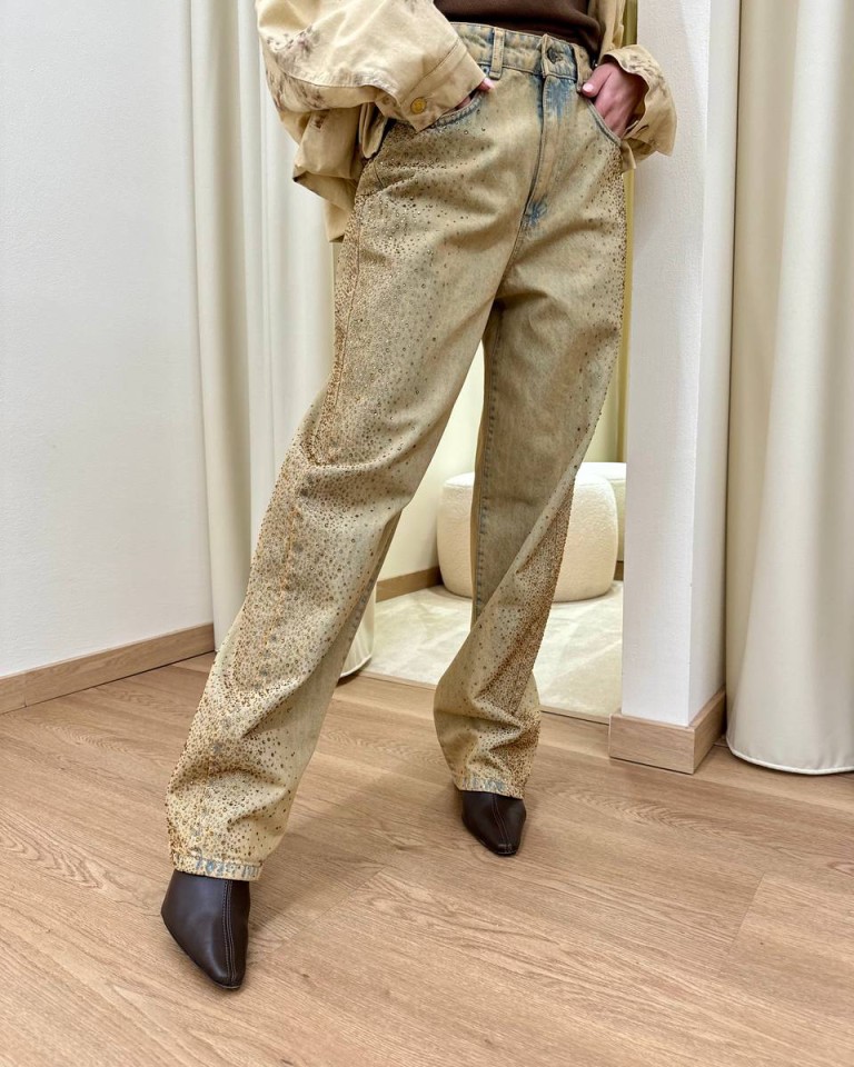Jeans in denim effetto invecchiato con strass color caramello sfumati, modello balloon, gamba larga, quattro tasche, chiusura con zip e bottone. Vestibilità regolare.