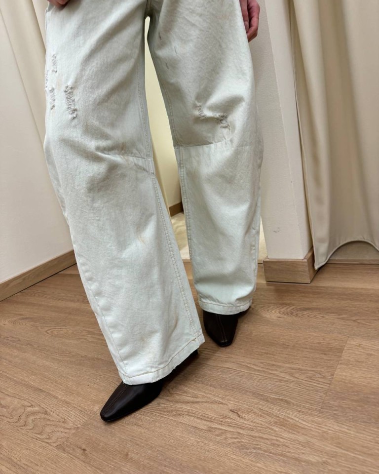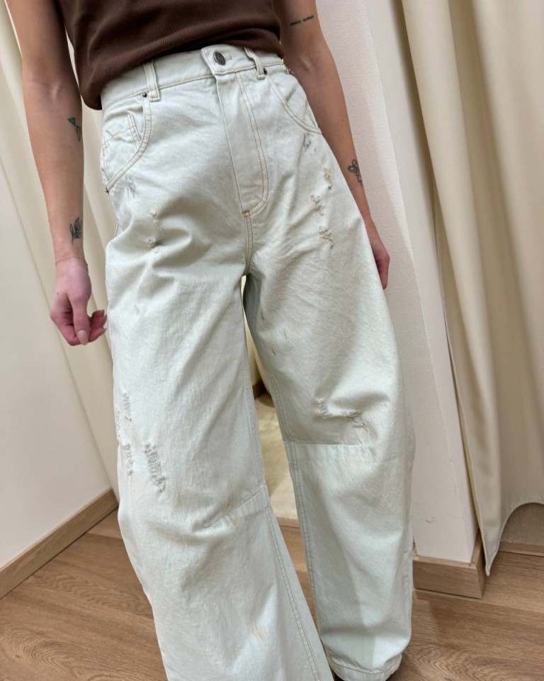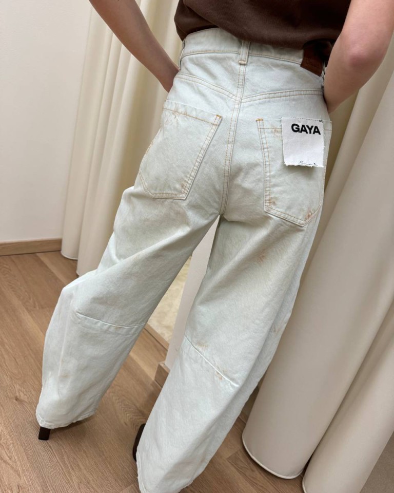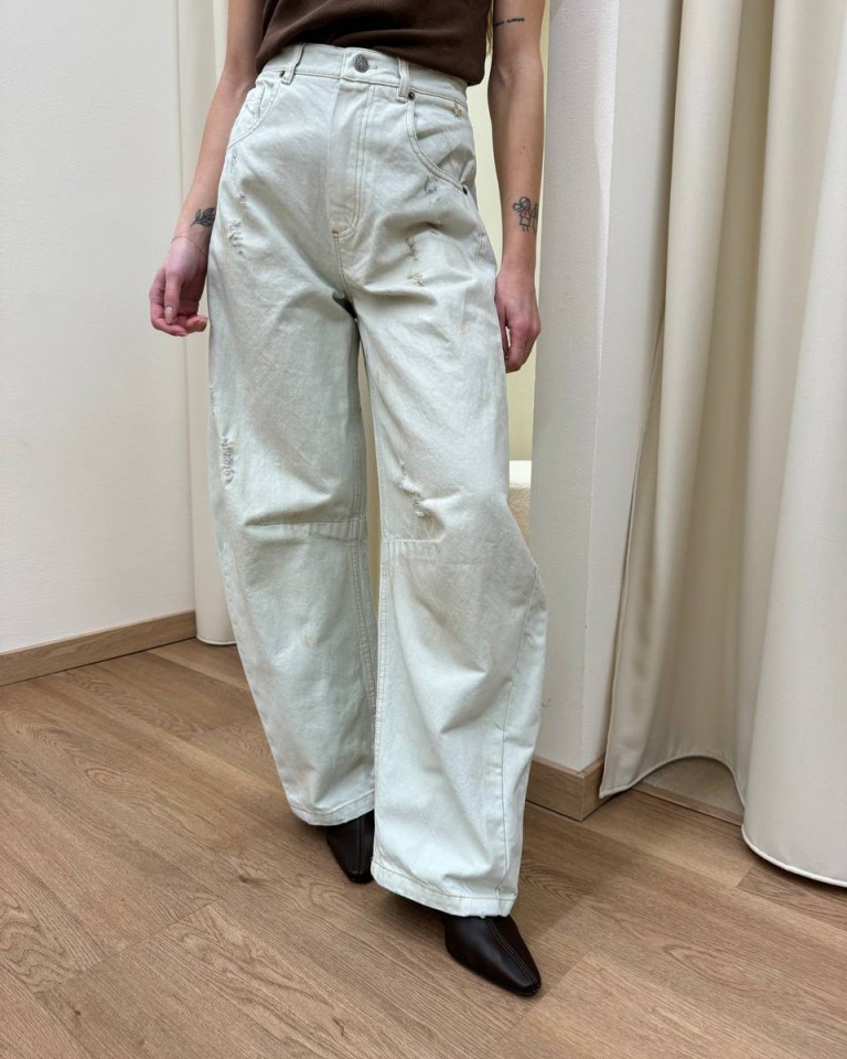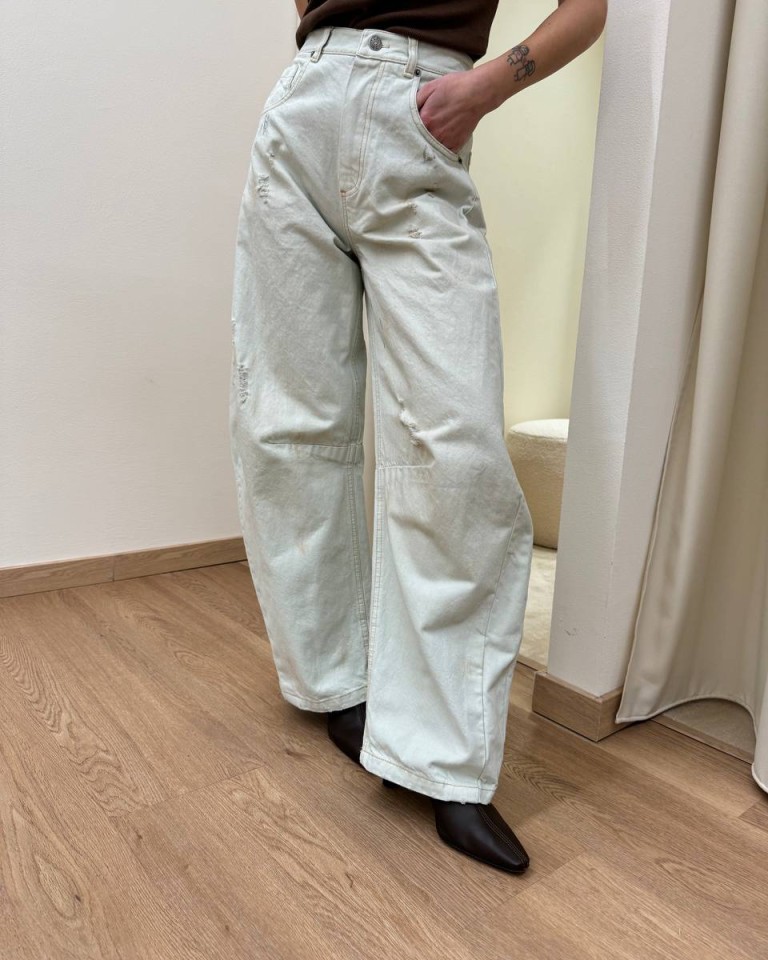 Jeans Gaya chiaro invecchiato con rotture, modello wide leg a ferro di cavallo, vita alta. Cinque tasche. Chiusura frontale con zip e bottone in metallo. Vestibilità regolare.
