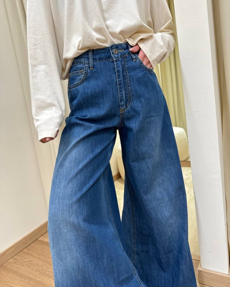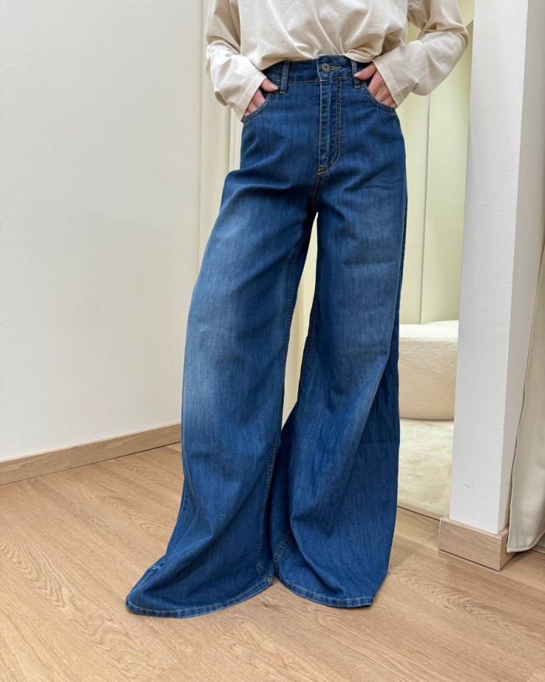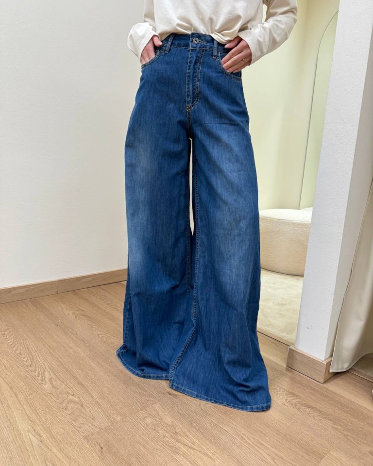Jeans “Gerbera” in denim blu scuro sfumato con cuciture a contrasto ocra, modello a palazzo a gamba ampia, vita alta, cinque tasche. Vestibilità vita piccola e gamba larga.
