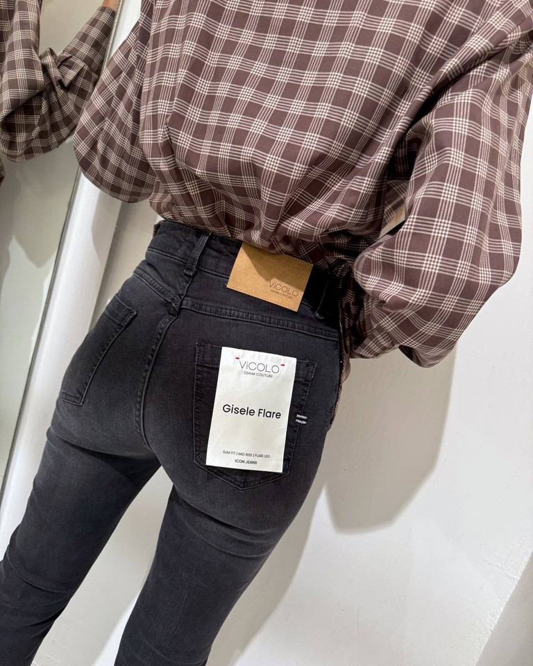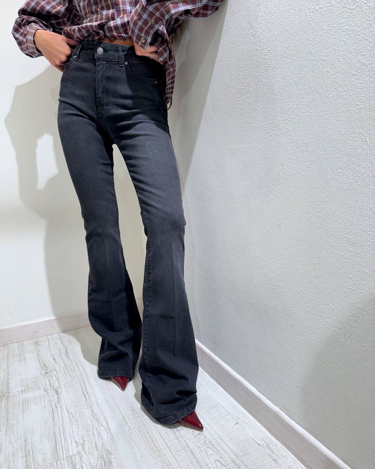 Jeans “Gisele Flare” lavaggio nero, modello vita medio alta con gamba aderente e sul fondo a zampa, cinque tasche e chiusura frontale con zip e bottone. Vestibilità aderente ed elasticizzata.