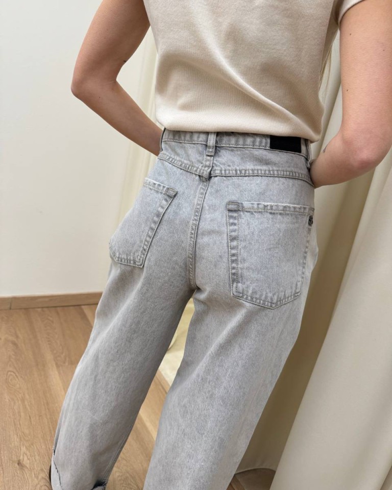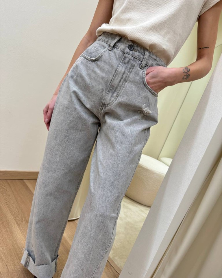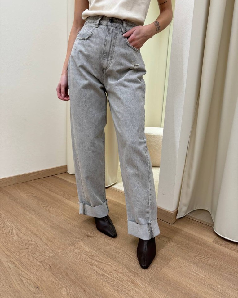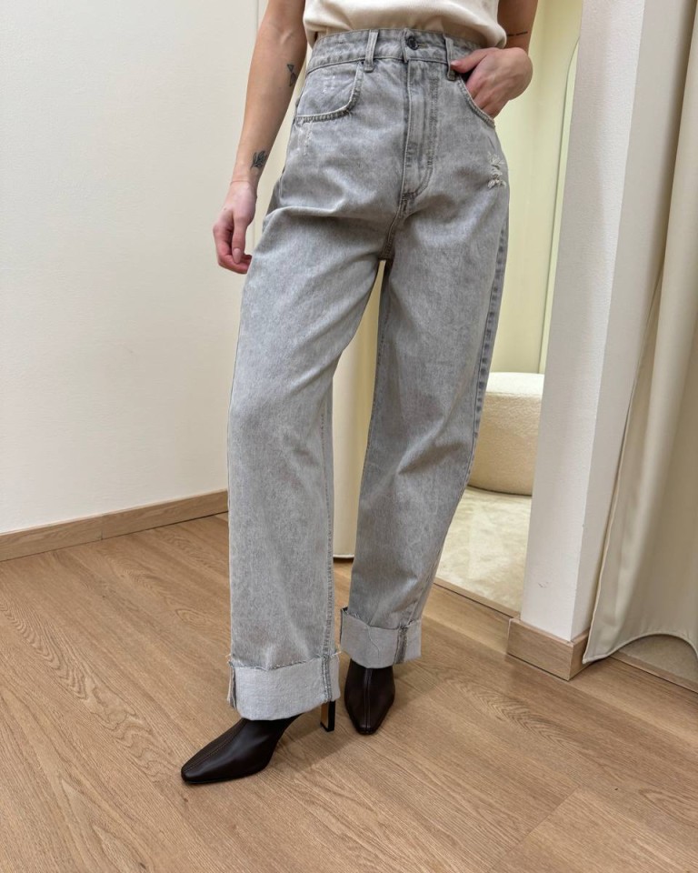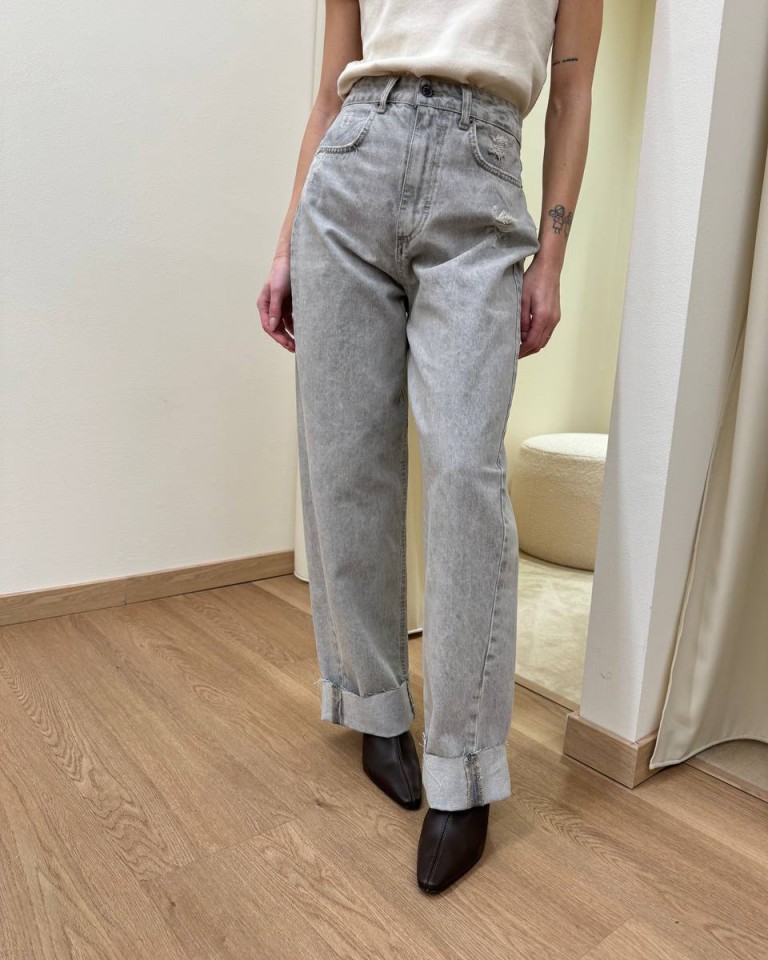 Jeans grigio chiaro con rotture, modello baggy fit, ampio, con cinque tasche e orlo rovesciato. Chiusura frontale con zip e bottone in metallo. Vita media e gamba ampia. Vestibilità regolare.