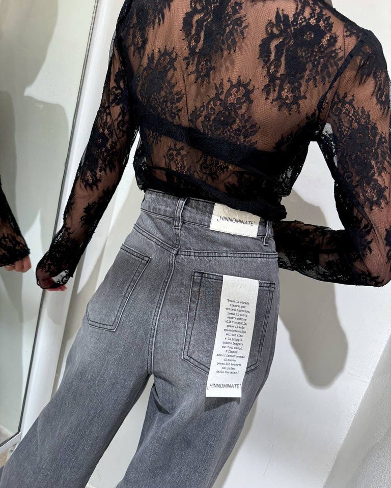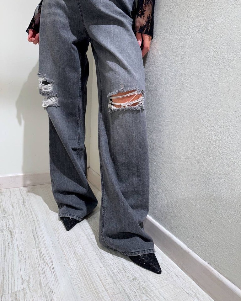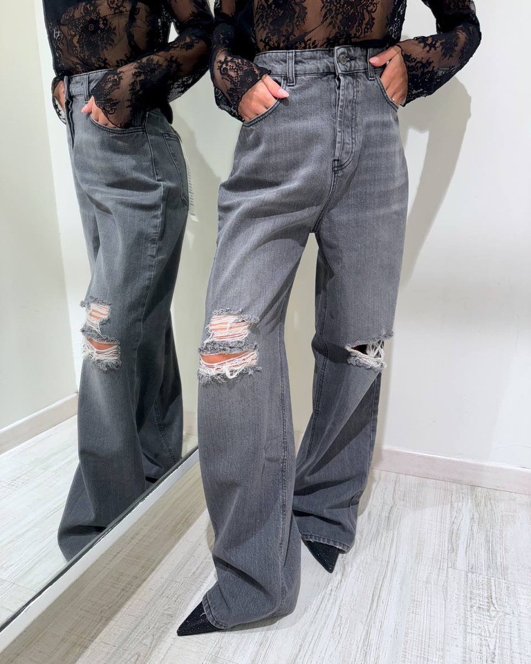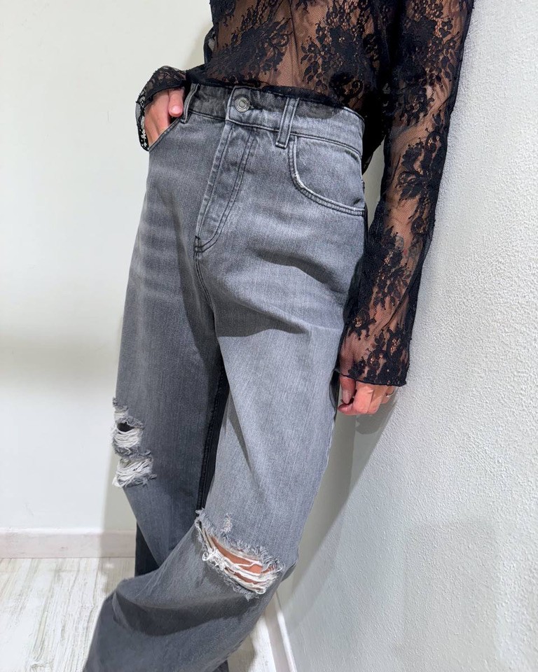 Jeans lavaggio grigio in bull con dettagli rotture, modello dritto, vita alta con chiusura frontale con zip e bottoni, tasche laterali. Vestibilità ampia.