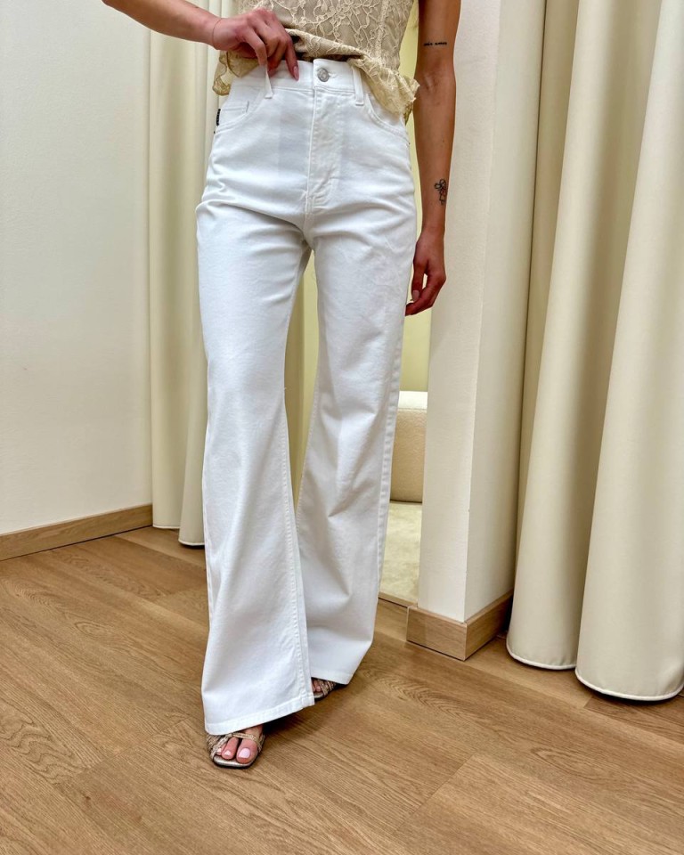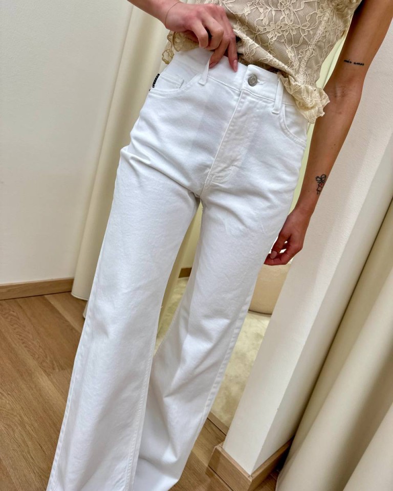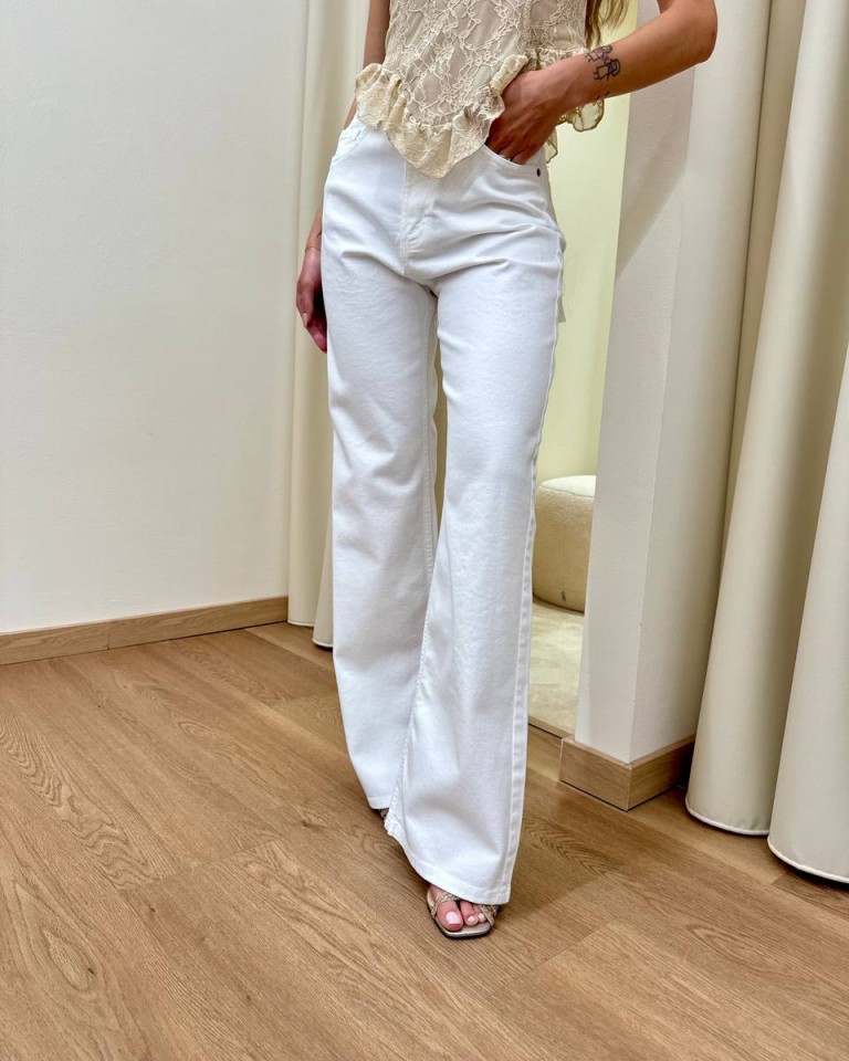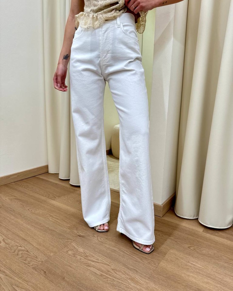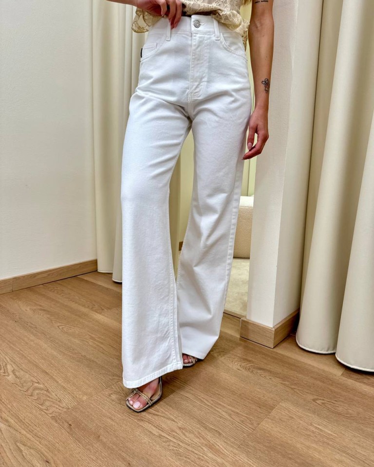 Jeans London bianco, modello palazzo, vita medio alta, cinque tasche, chiusura con zip e bottone. Vestibilità regolare.
