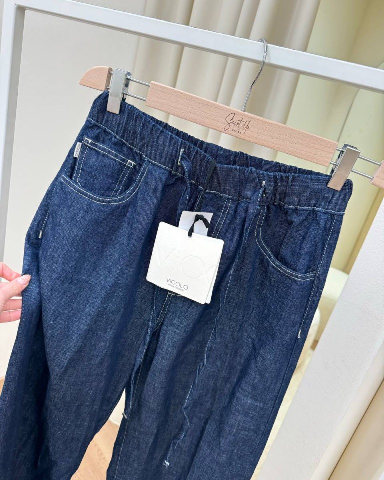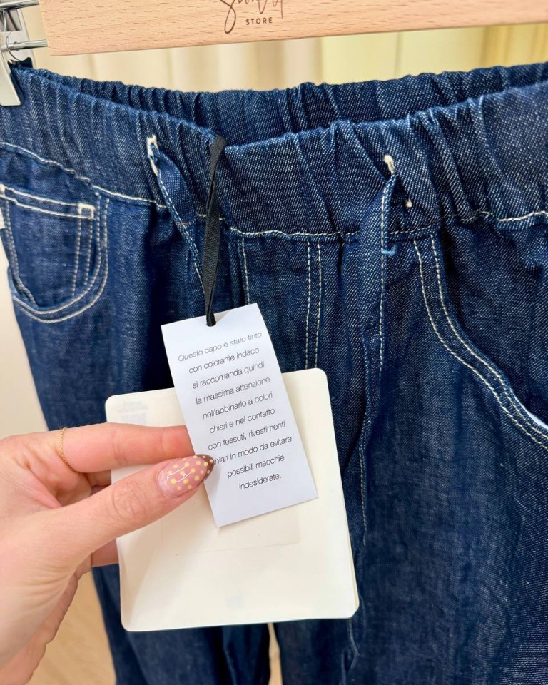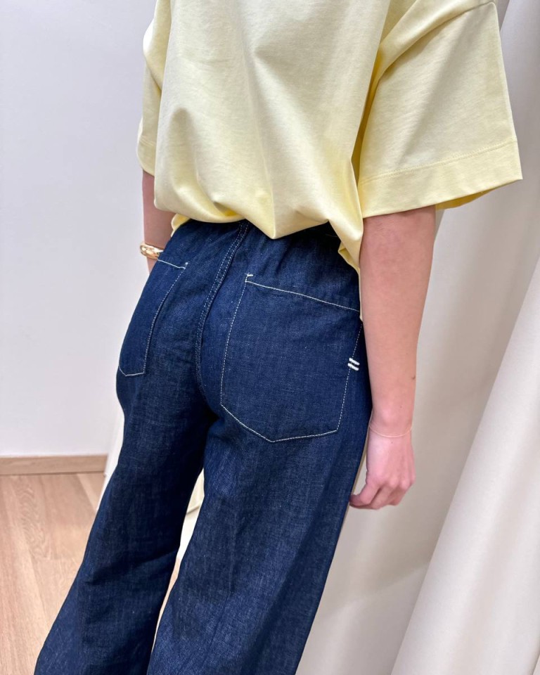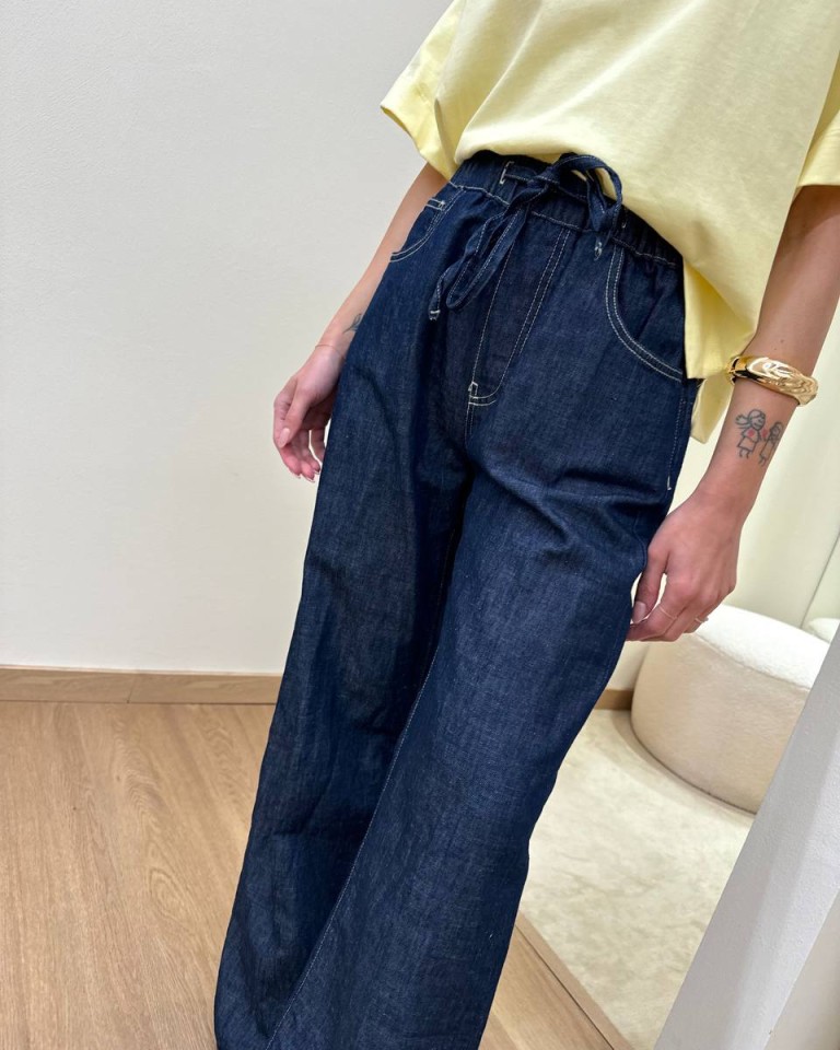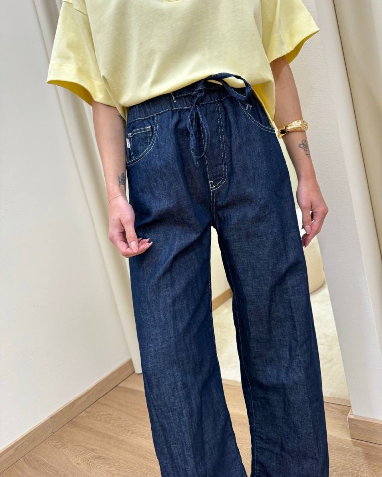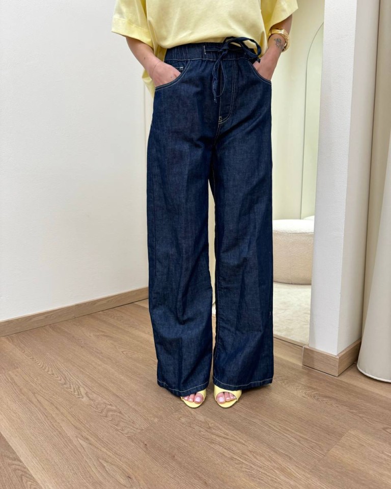 Jeans Luisa in denim blu scuro, modello a palazzo a gamba larga, vita alta con coulisse regolabile, cinque tasche. Vestibilità regolare.