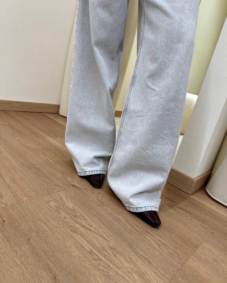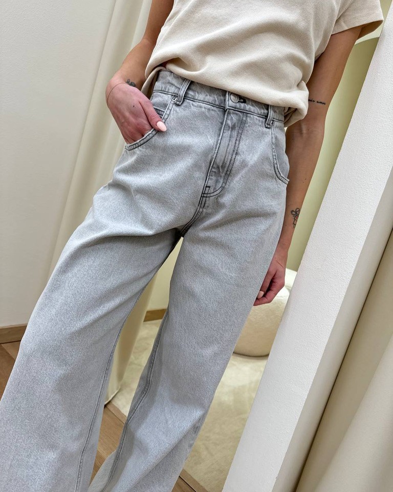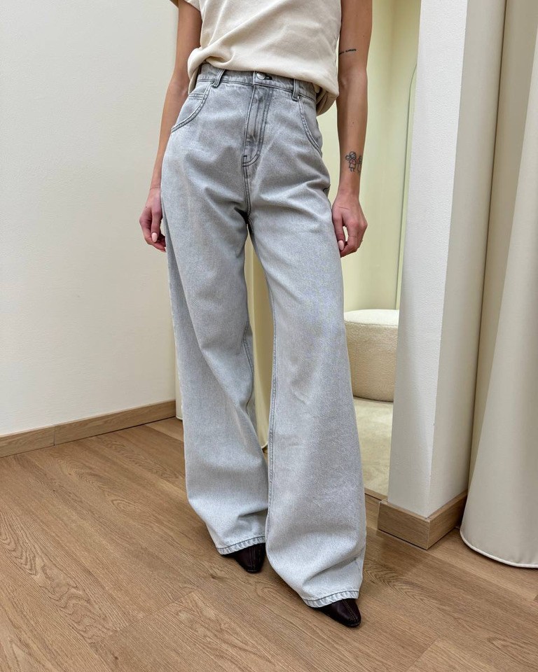 Jeans Mia grigio chiaro, modello baggy fit, ampio, con cinque tasche. Chiusura frontale con zip e bottone in metallo. Vita media e gamba ampia. Vestibilità regolare.