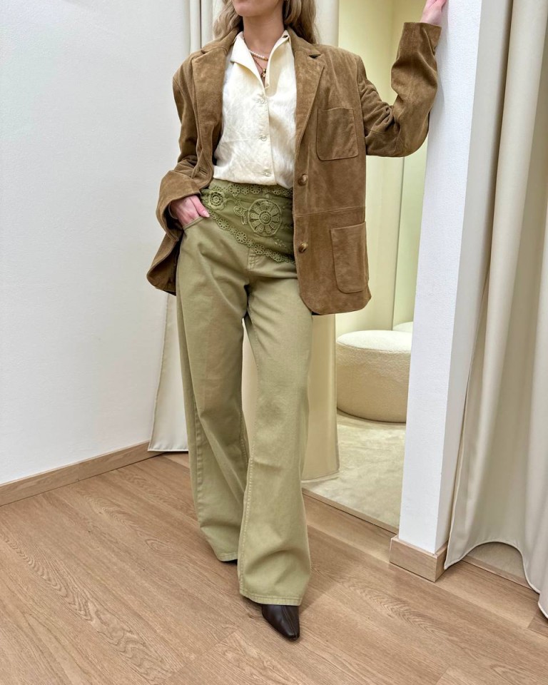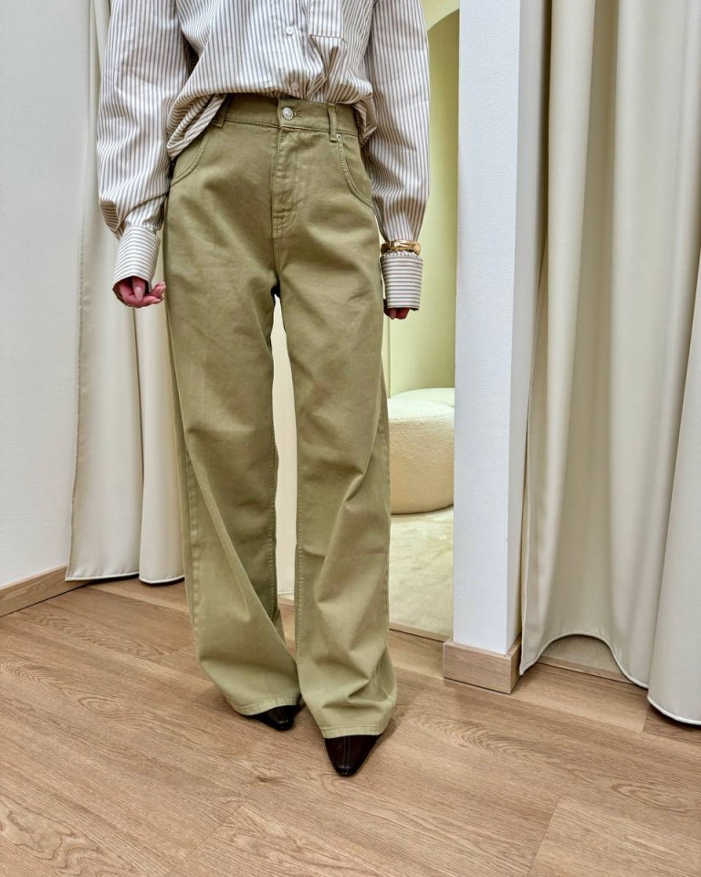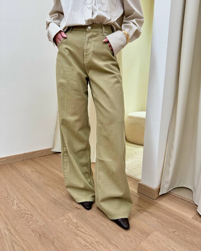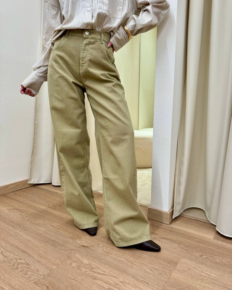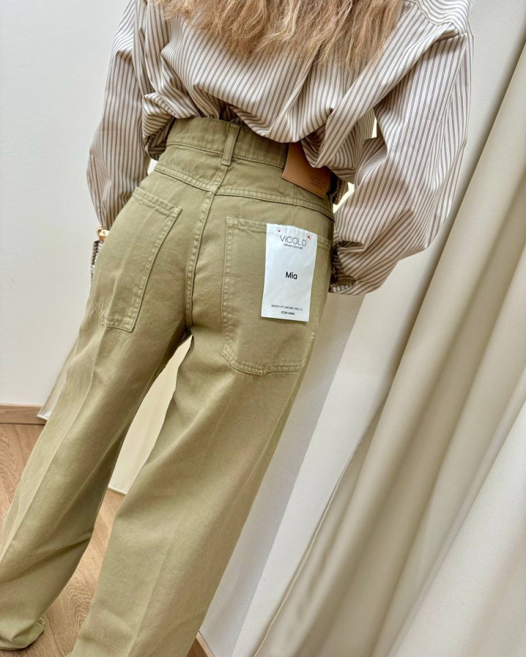 Jeans Mia color olio, modello baggy fit, ampio, con cinque tasche. Chiusura frontale con zip e bottone in metallo. Vita media e gamba ampia. Vestibilità regolare.