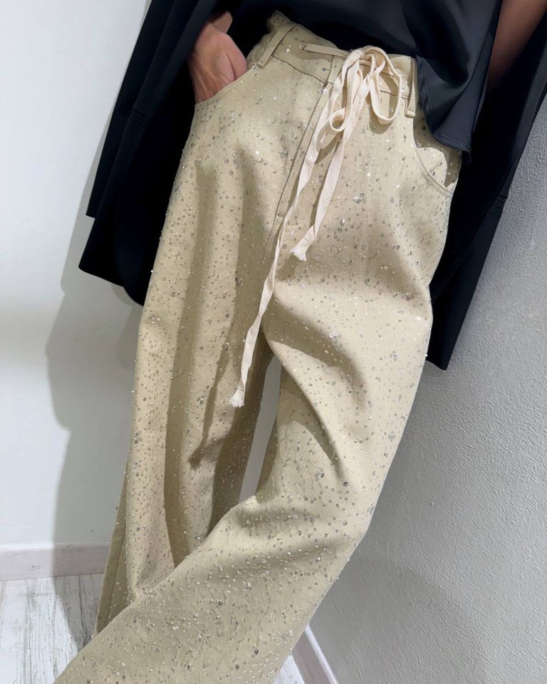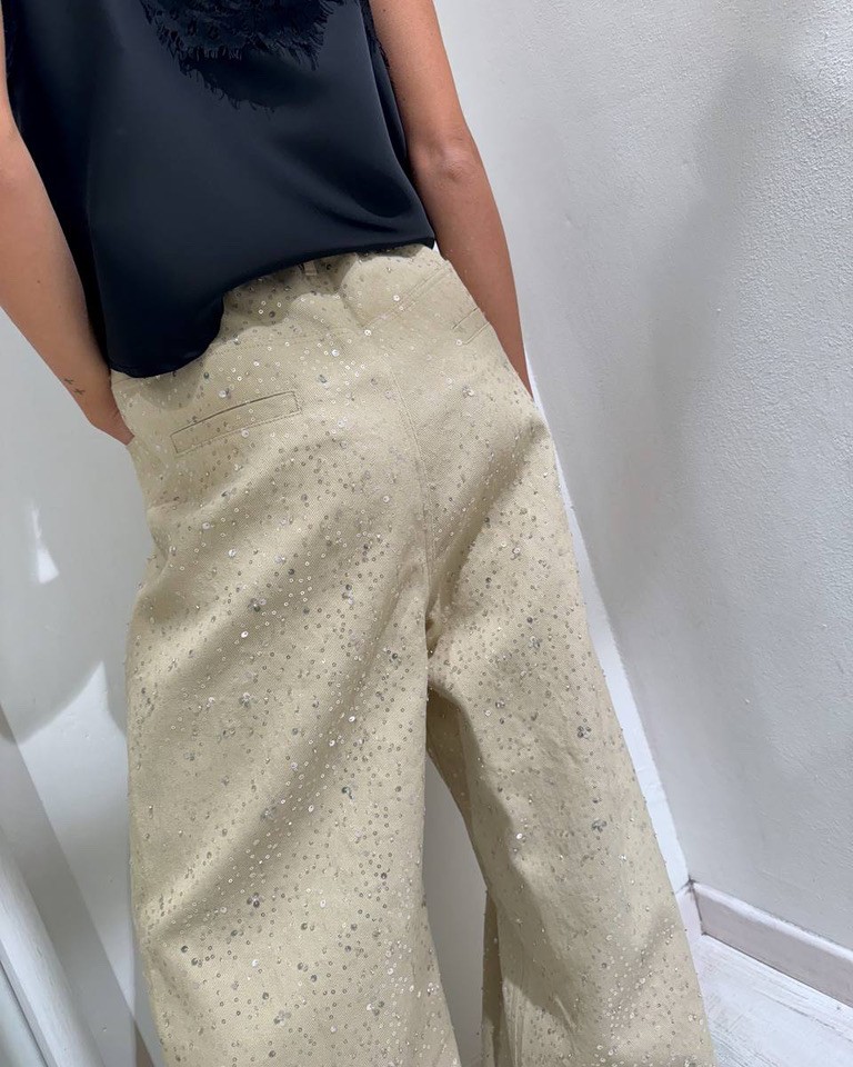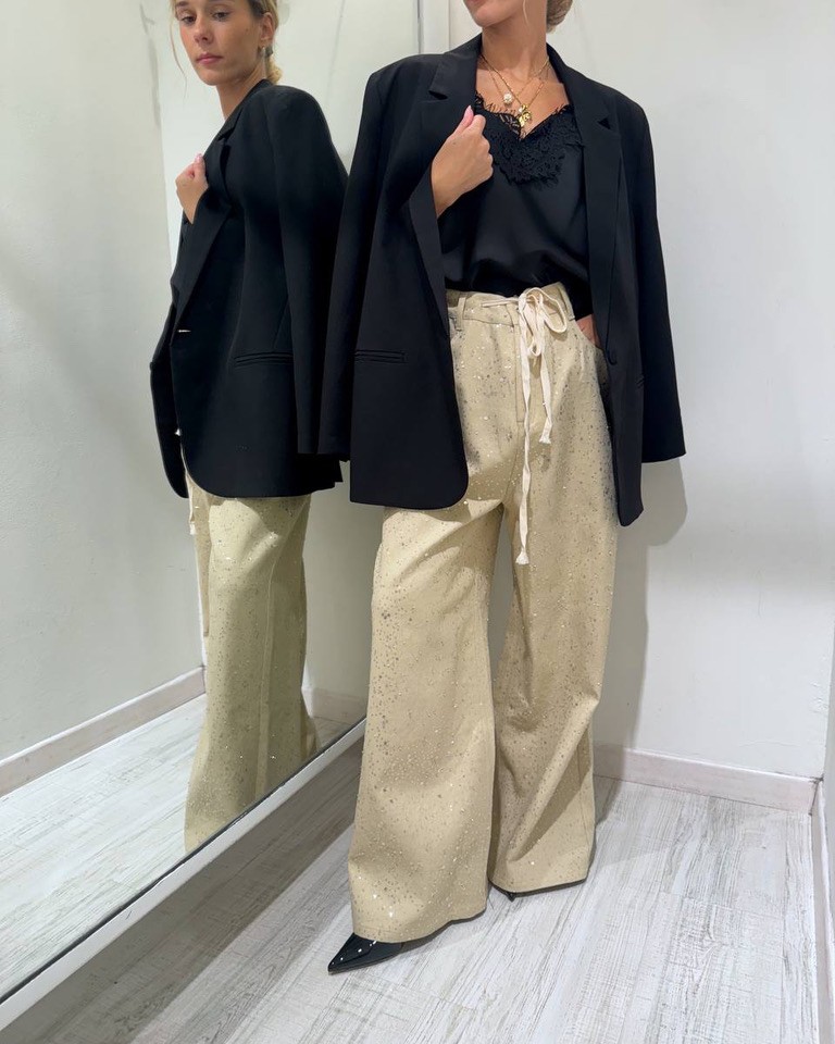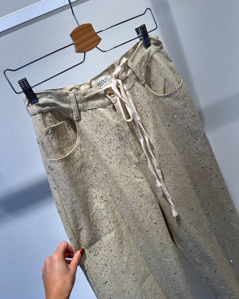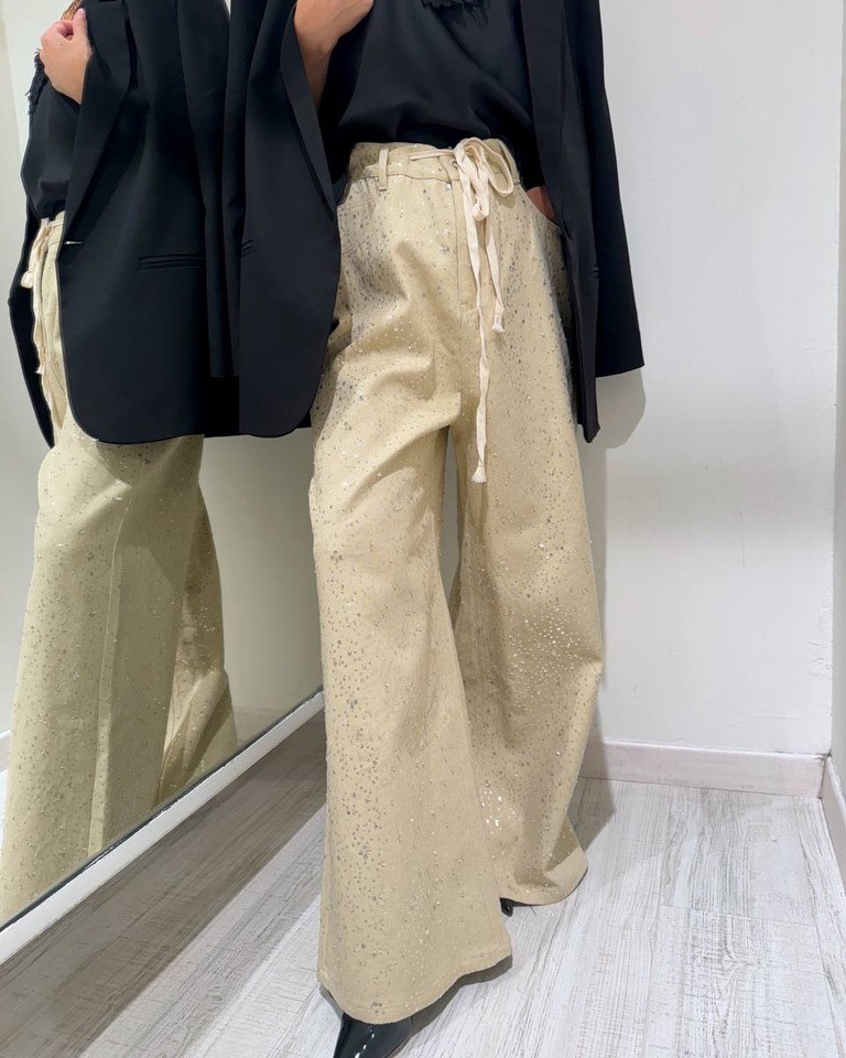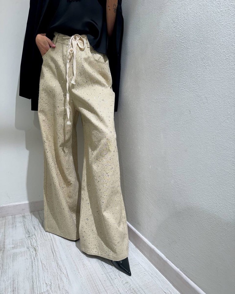 Jeans color beige ricoperto da micro paillettes, modello palazzo ampio con vita alta e cavallo basso. Cinque tasche e laccio in vita regolabile e chiusura frontale con zip e bottone. Vestibilità morbida.