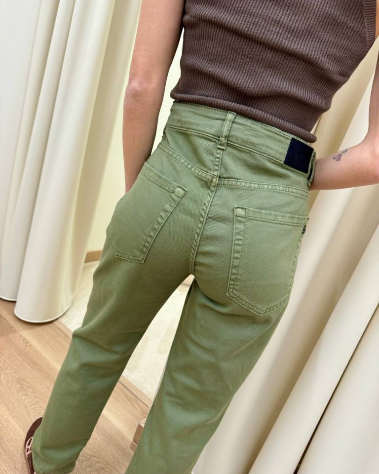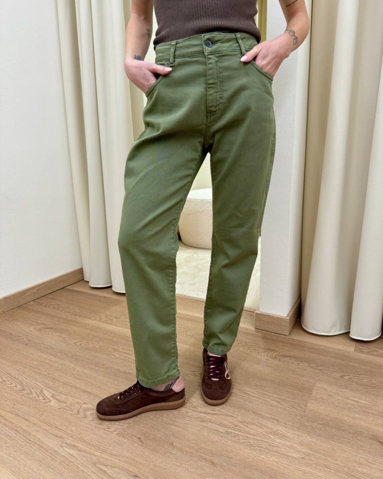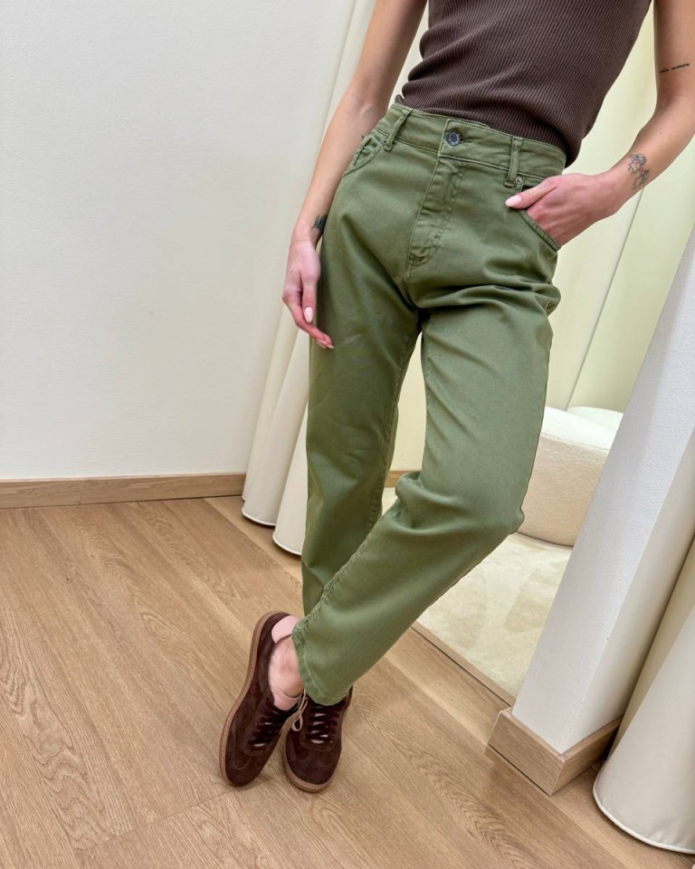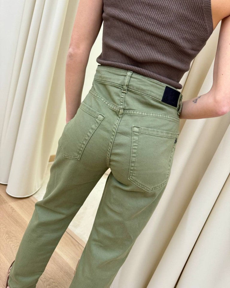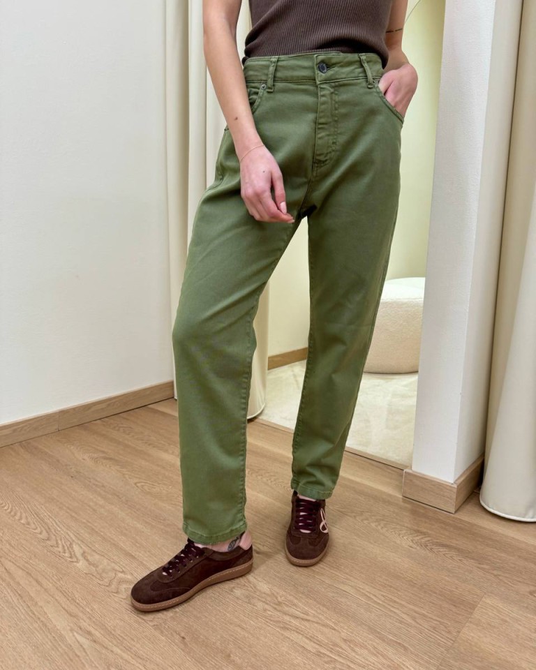 Jeans verde militare, modello a sigaretta, vita medio alta, cinque tasche, chiusura con zip e bottone. Vestibilità regolare.