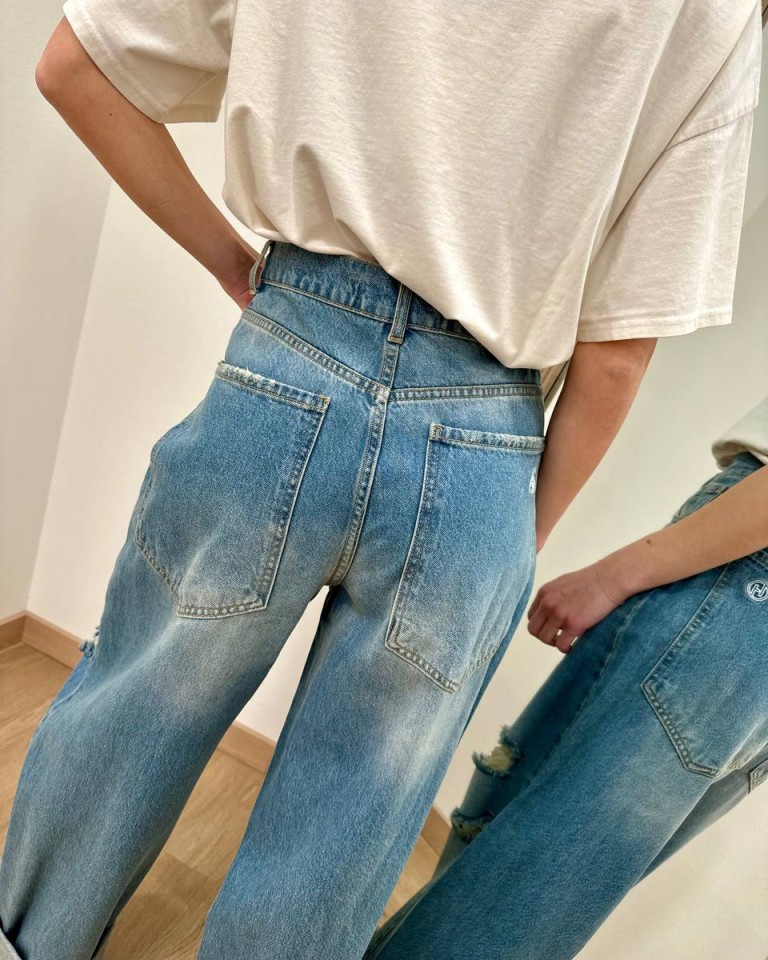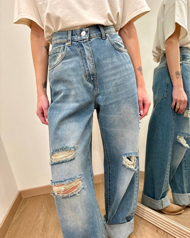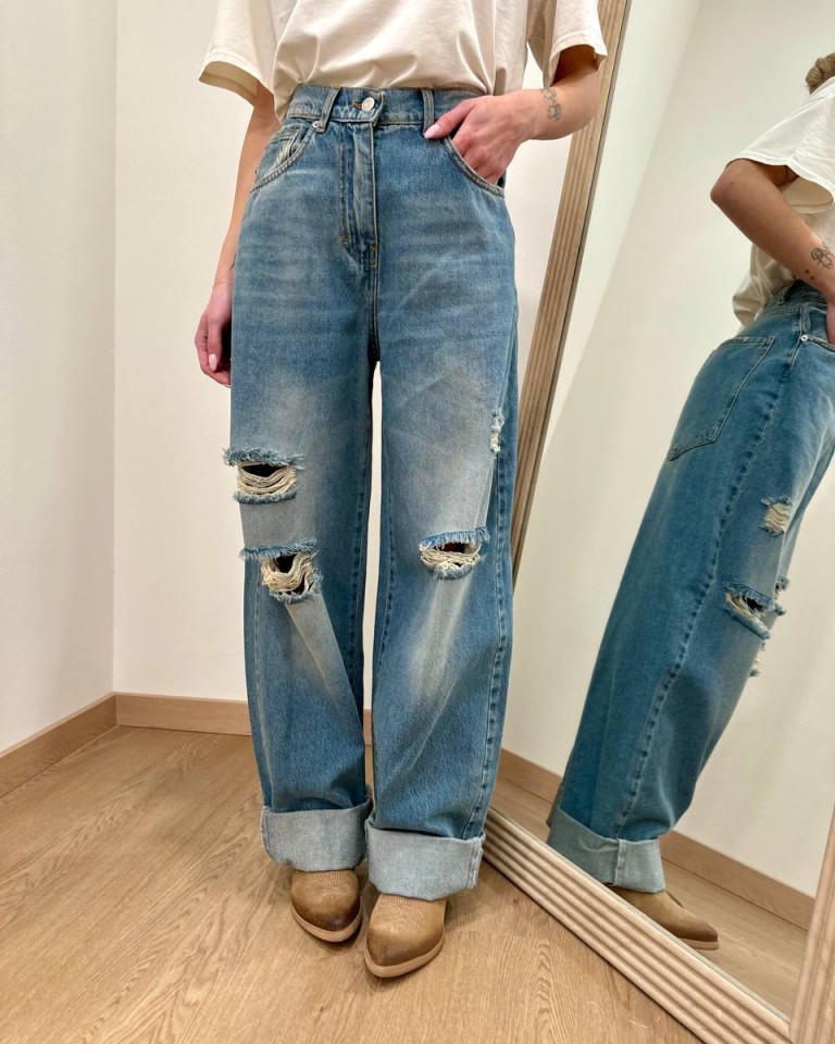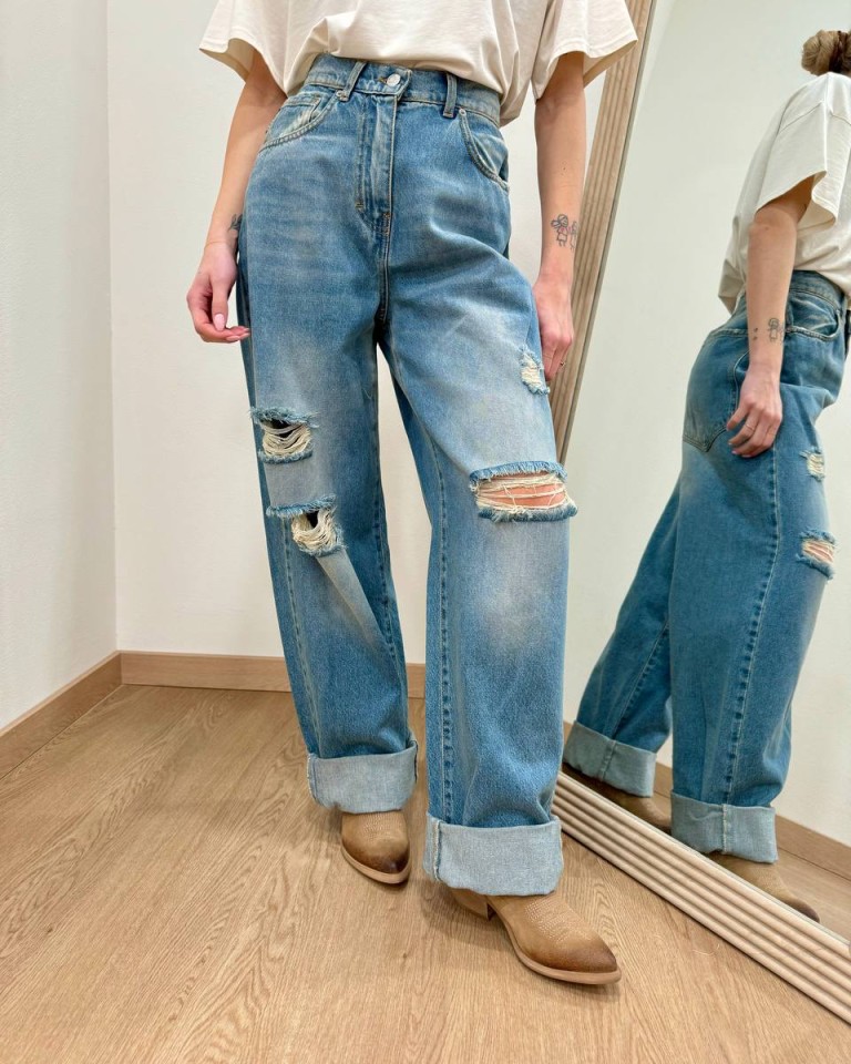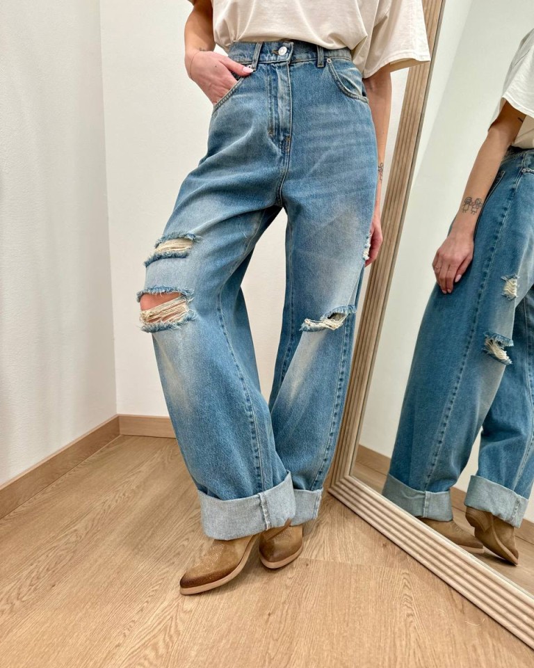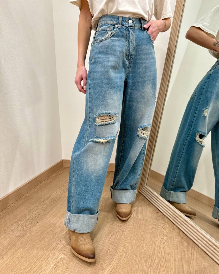 Jeans “Stella” denim sfumato con rotture, modello gamba larga e dritta, vita medio alta, orlo con rovescia e chiusura frontale con zip e bottone. Tasche dietro over. Vestibilità regolare.