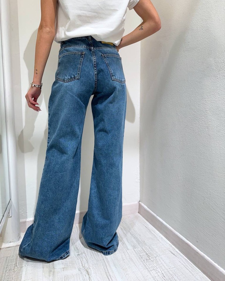 Jeans Tokyo lavaggio denim, modello gamba dritta e zampa sul fondo, con vita media, cabochon applicati lungo i fianchi e cinque tasche. Chiusura frontale con zip e bottone. Vestibilità regolare.