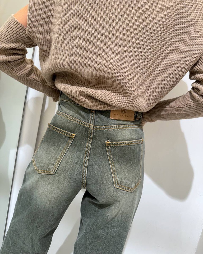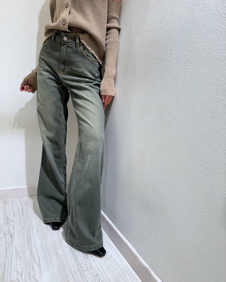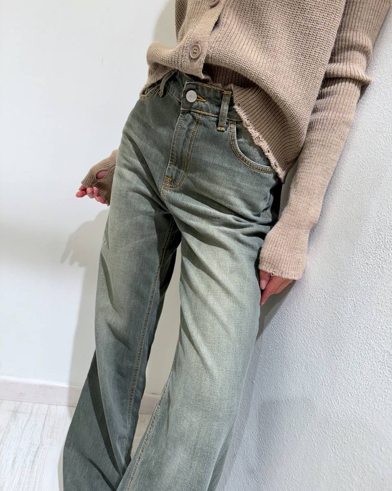 Jeans Tokyo lavaggio verde militare sfumato, modello gamba dritta e zampa sul fondo , con vita media e cinque tasche. Chiusura frontale con zip e bottone. Vestibilità regolare.