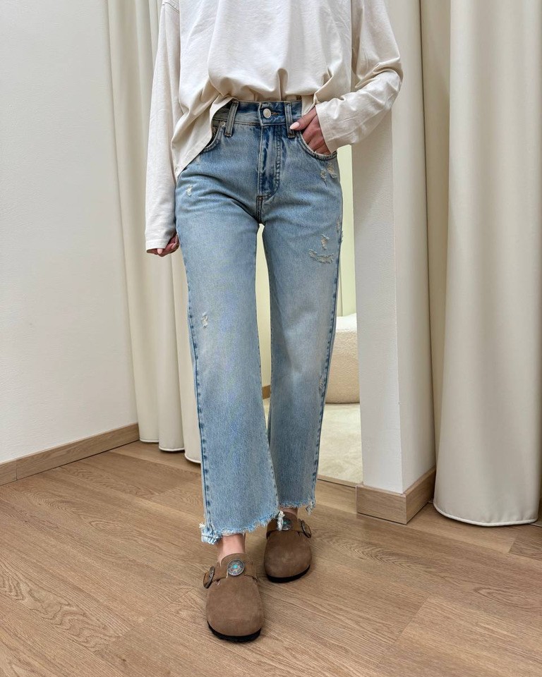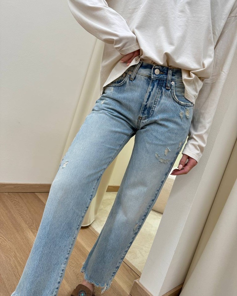 Jeans Zeke in denim chiaro sfumato, modello dritto con rotture e vita medio bassa, orlo sfrangiato e chiusura frontale con zip e bottone. Cinque tasche. Vestibilità regolare (se si oscilla tra due taglie consigliamo di aquistare la taglia sopra).