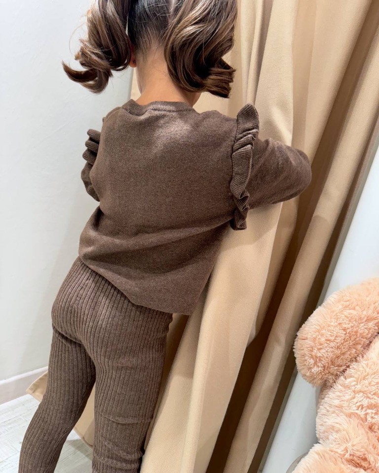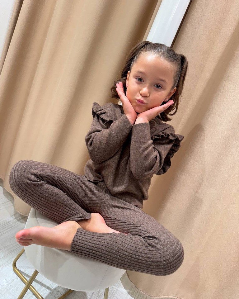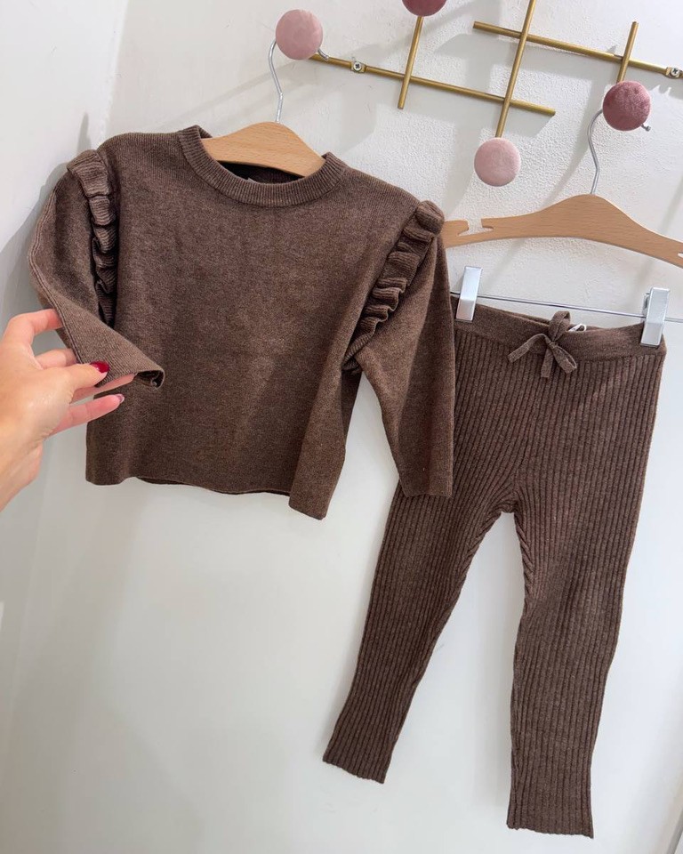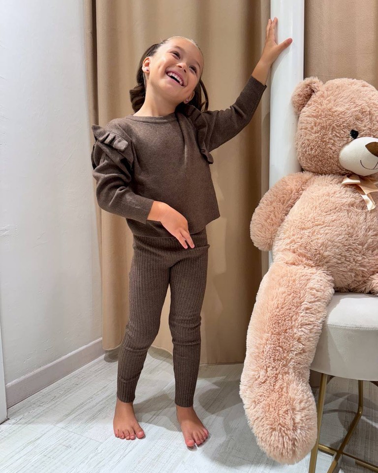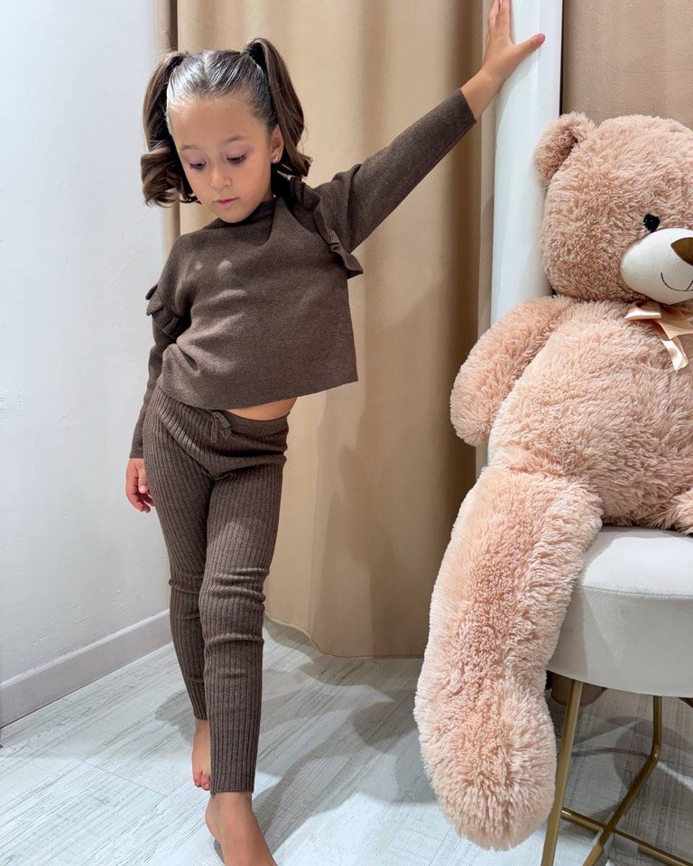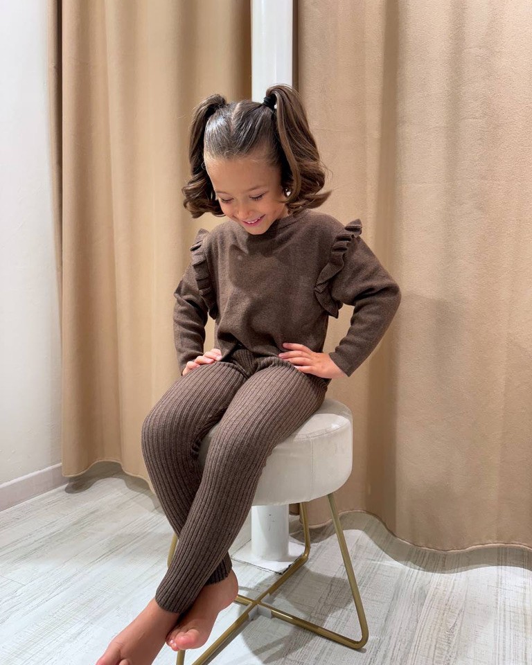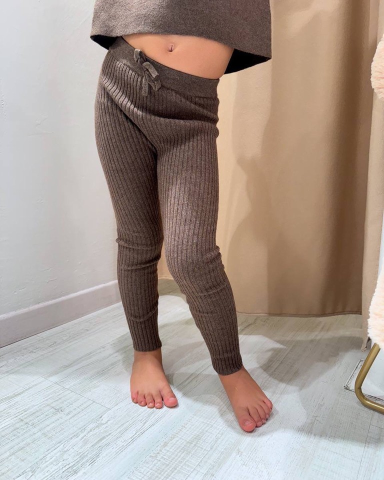 Leggings in maglia a costine color cioccolato, modello vita alta con coulisse ed elastico alto. Vestibilità aderente ed eelasticizzata.