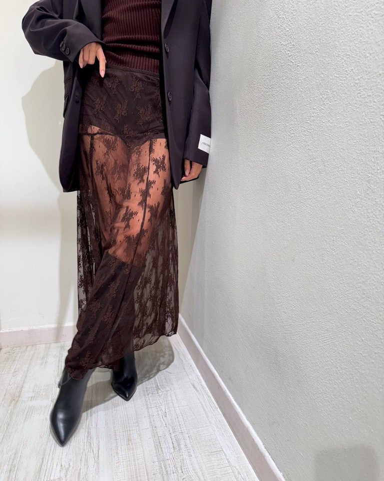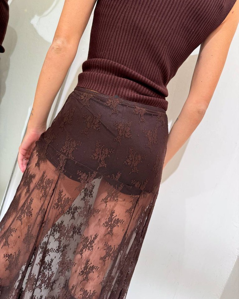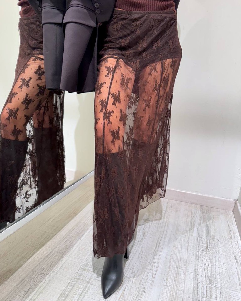 Longuette semitrasparente moro con pizzo, modello midi con elastico e culotte interna in tono. Vestibilità regolare.